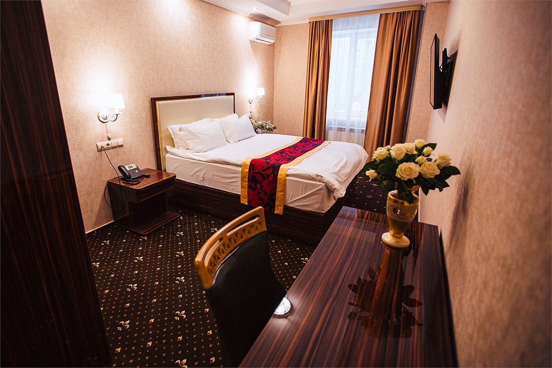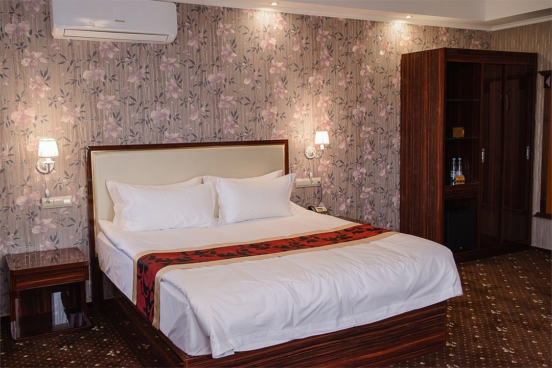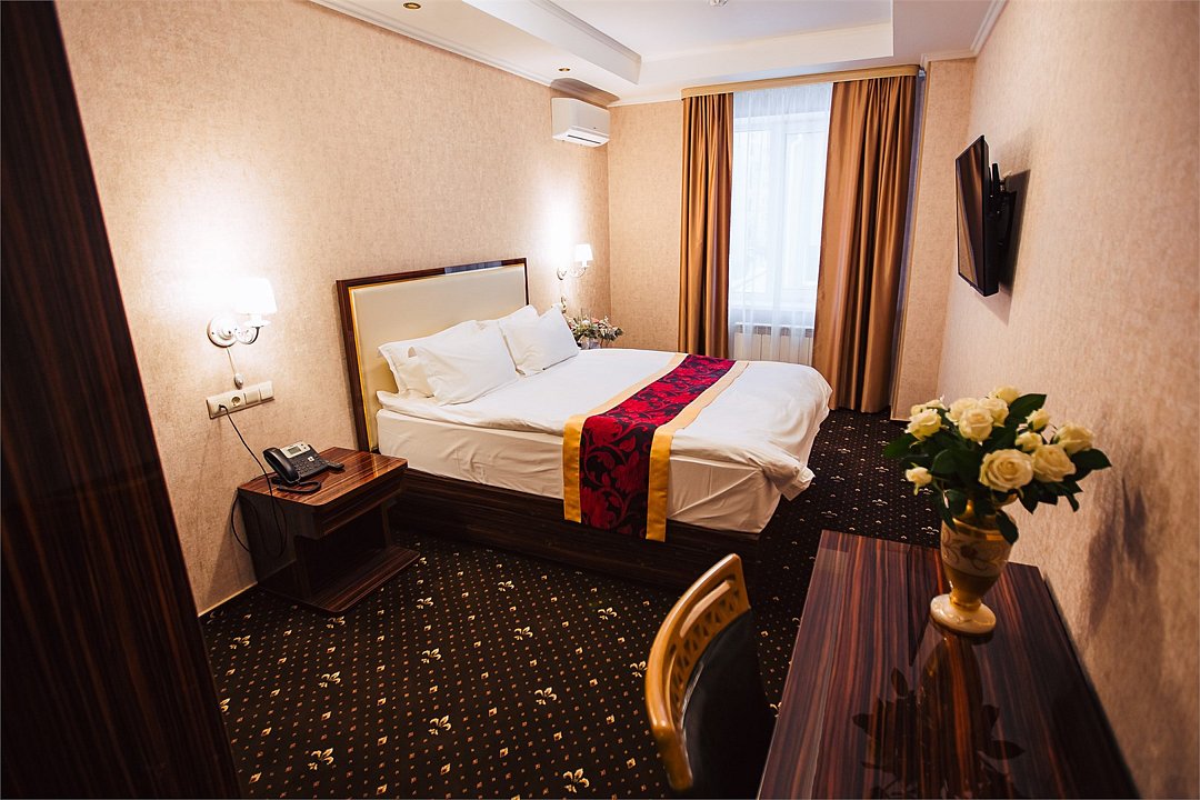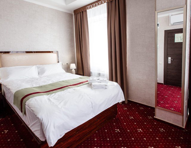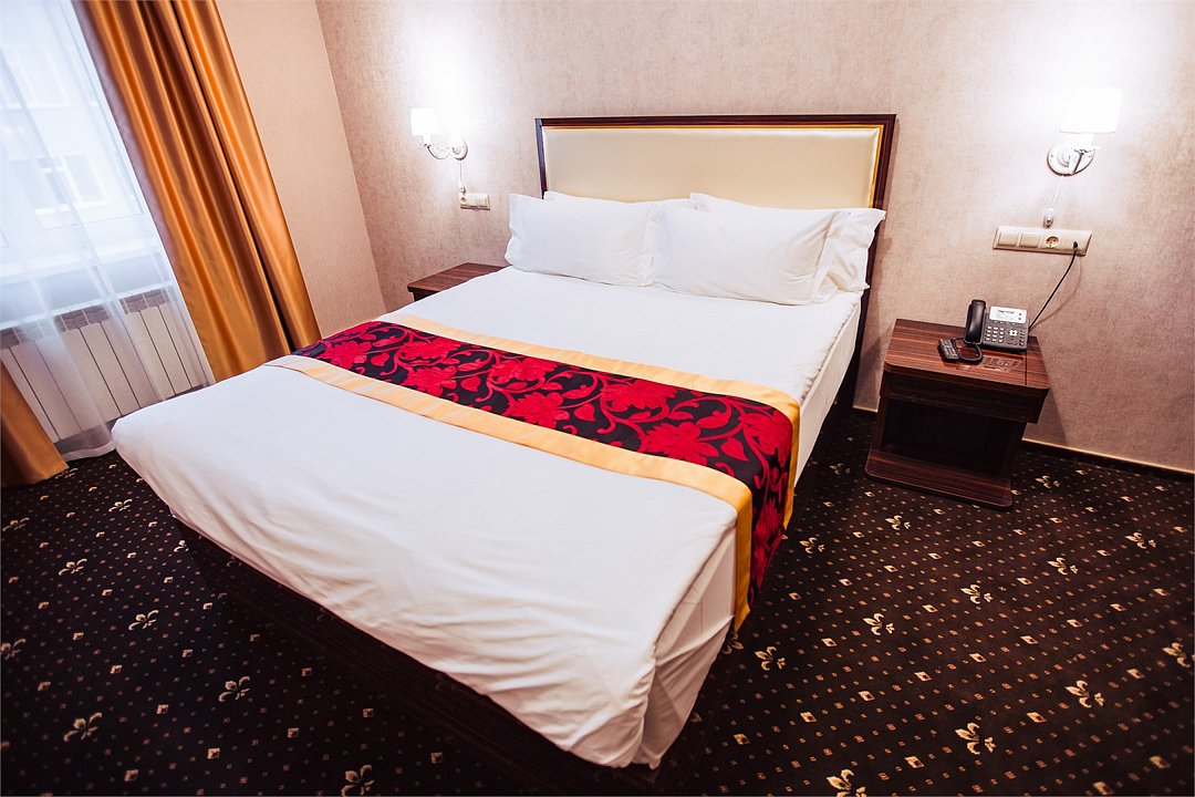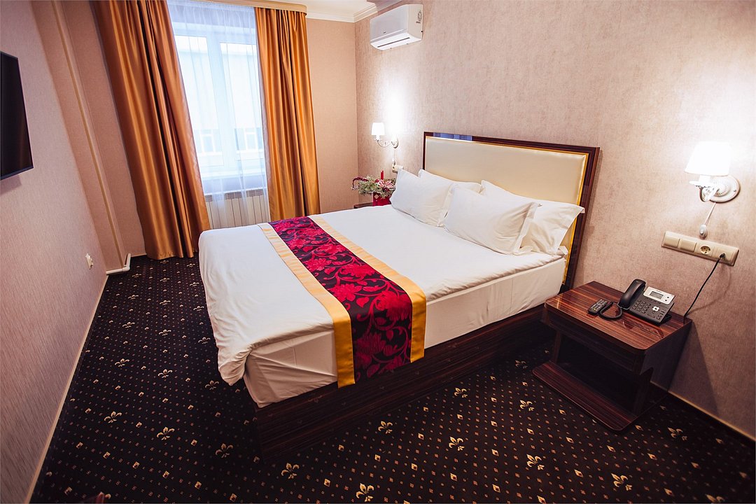Номер категории «СТАНДАРТ» • система «Умный дом»; • централизованная система управления климатом; • кровать king size; • комфортный матрас «Аскона»; • телевизор Smart TV; • сейф с электронным замком, зарядные USB-порты у стола и прикроватных тумбочек, • ванная комната с тропическим душем, подогреваемым полом, встроенной в зеркало подсветкой для обеспечения максимального комфорта, фен; • восхитительно мягкие махровые полотенца и халаты, дарящие нежность от прикосновения после расслабляющего душа; • косметические средства RELAX REFRESH REVIVE; • мини-бар с холодильником; • журнальный столик с двумя креслами; • минеральная вода, электрический чайник, разные виды кофе и чая.Услуги и удобства