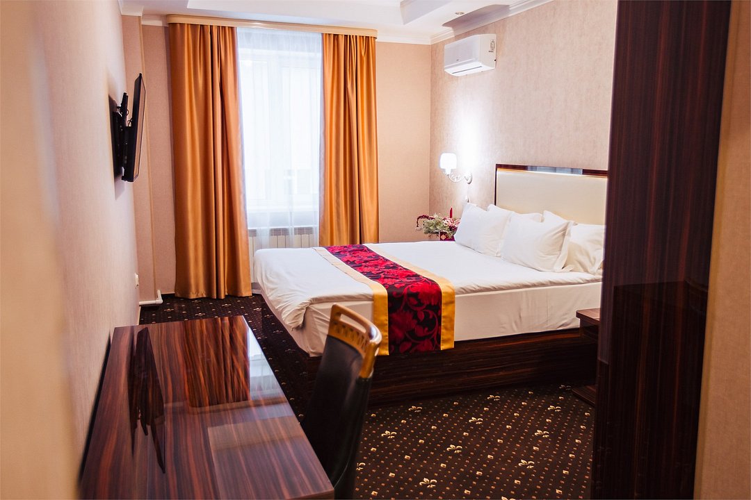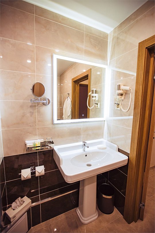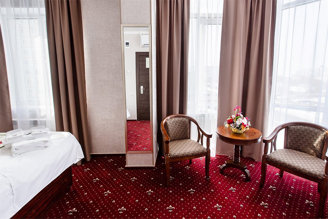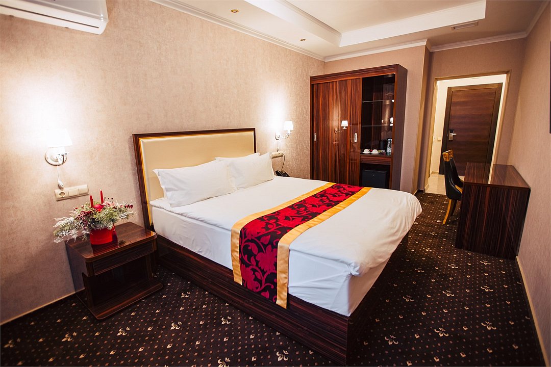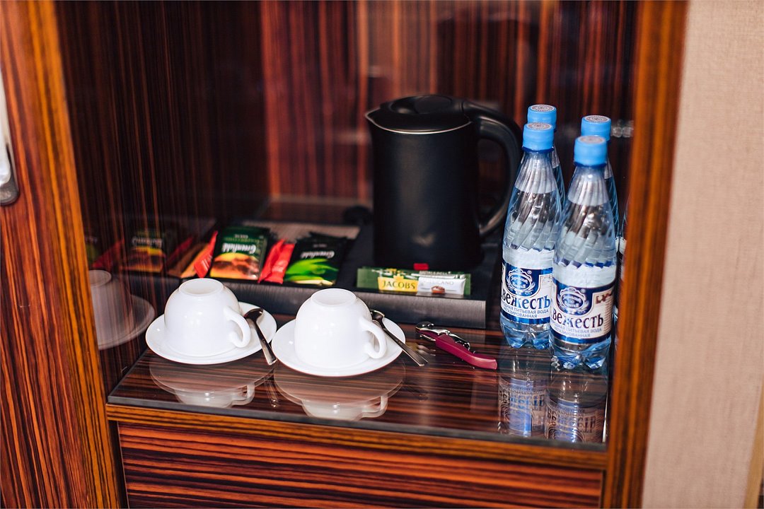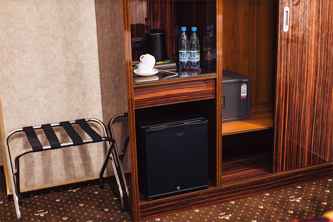 Номер категории «СТАНДАРТ» • система «Умный дом»; • централизованная система управления климатом; • кровать king size; • комфортный матрас «Аскона»; • телевизор Smart TV; • сейф с электронным замком, зарядные USB-порты у стола и прикроватных тумбочек, • ванная комната с тропическим душем, подогреваемым полом, встроенной в зеркало подсветкой для обеспечения максимального комфорта, фен; • восхитительно мягкие махровые полотенца и халаты, дарящие нежность от прикосновения после расслабляющего душа; • косметические средства RELAX REFRESH REVIVE; • мини-бар с холодильником; • журнальный столик с двумя креслами; • минеральная вода, электрический чайник, разные виды кофе и чая.Услуги и удобства
