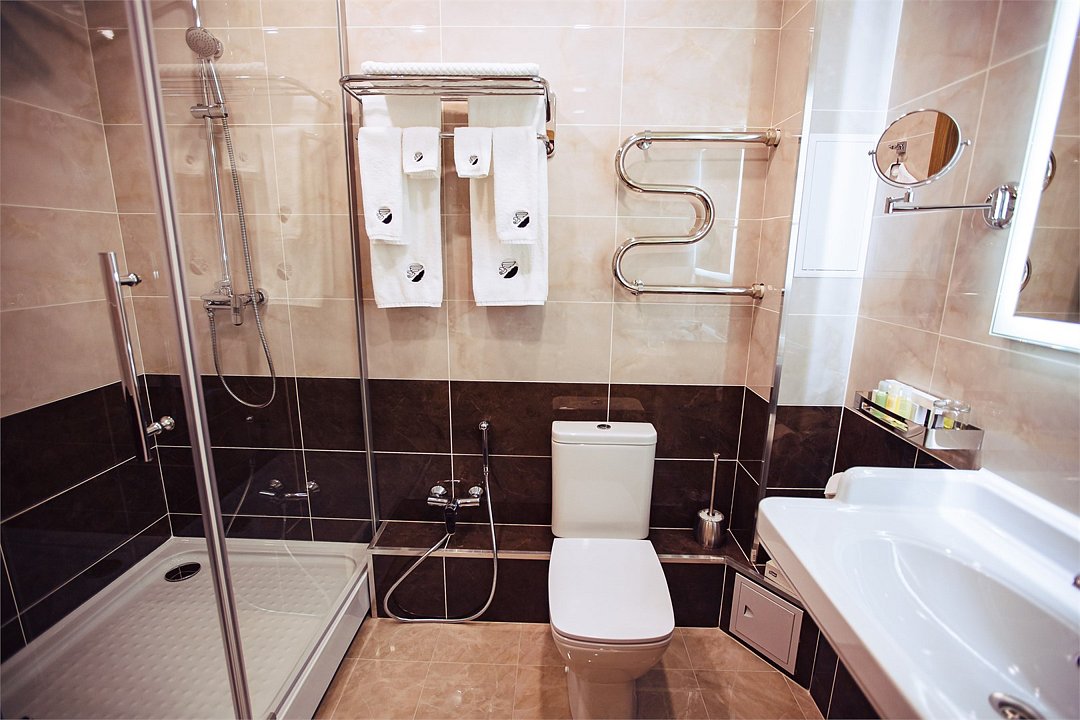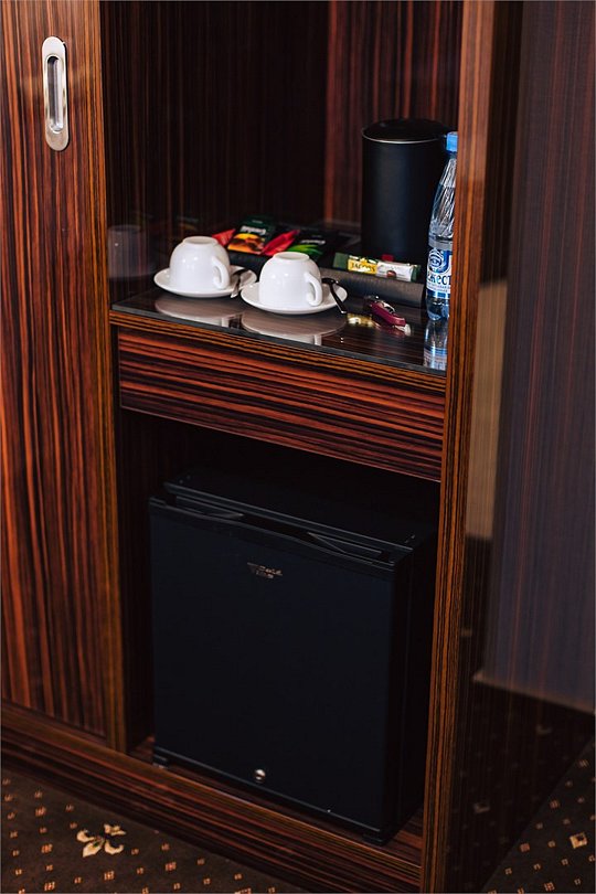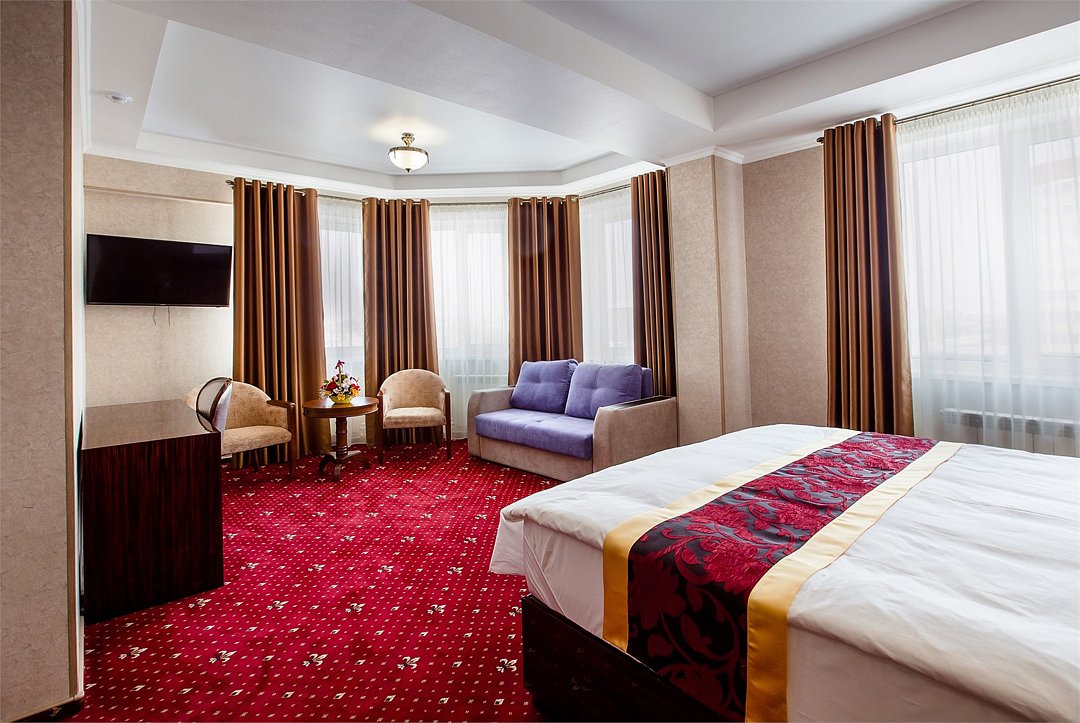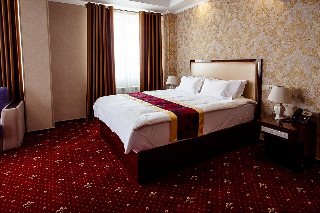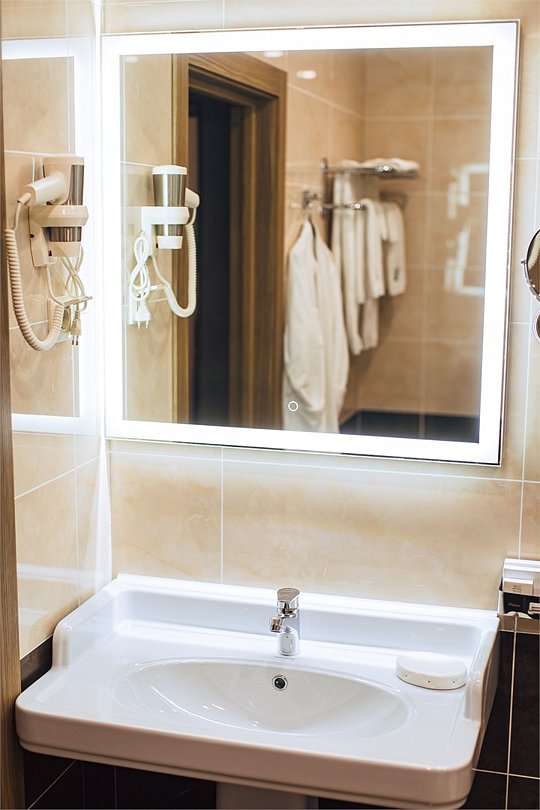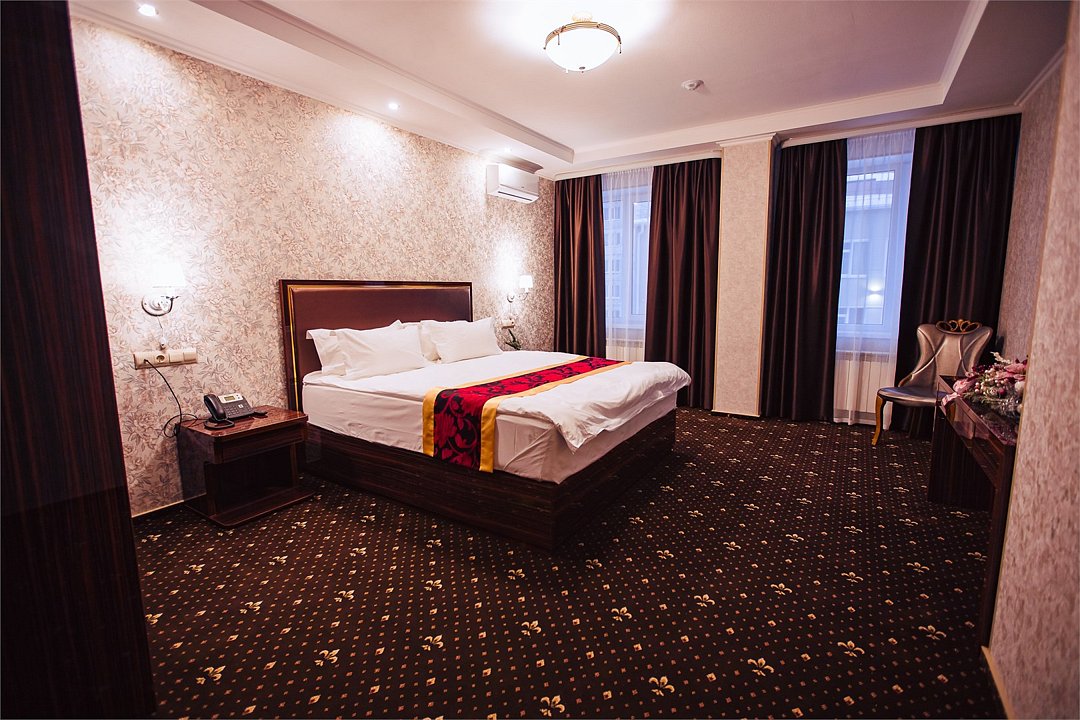 Номер категории «СТАНДАРТ» • система «Умный дом»; • централизованная система управления климатом; • кровать king size; • комфортный матрас «Аскона»; • телевизор Smart TV; • сейф с электронным замком, зарядные USB-порты у стола и прикроватных тумбочек, • ванная комната с тропическим душем, подогреваемым полом, встроенной в зеркало подсветкой для обеспечения максимального комфорта, фен; • восхитительно мягкие махровые полотенца и халаты, дарящие нежность от прикосновения после расслабляющего душа; • косметические средства RELAX REFRESH REVIVE; • мини-бар с холодильником; • журнальный столик с двумя креслами; • минеральная вода, электрический чайник, разные виды кофе и чая.Услуги и удобства