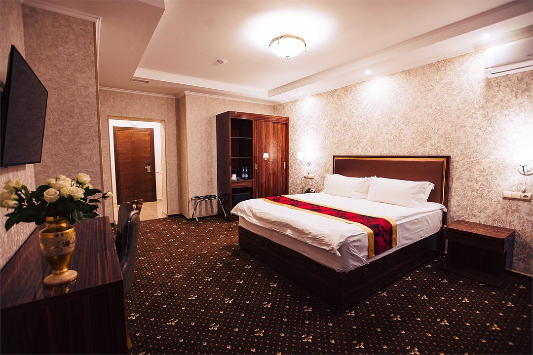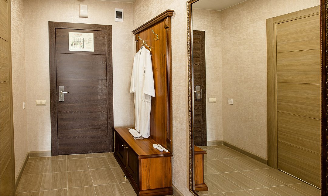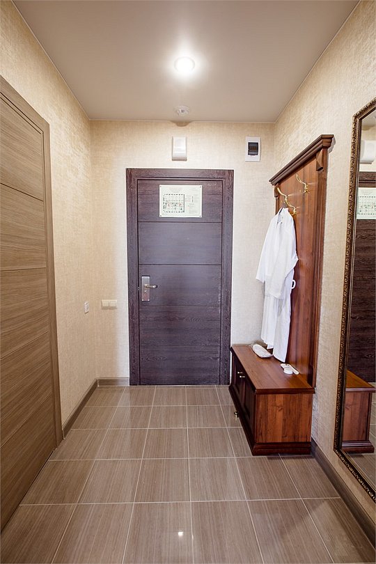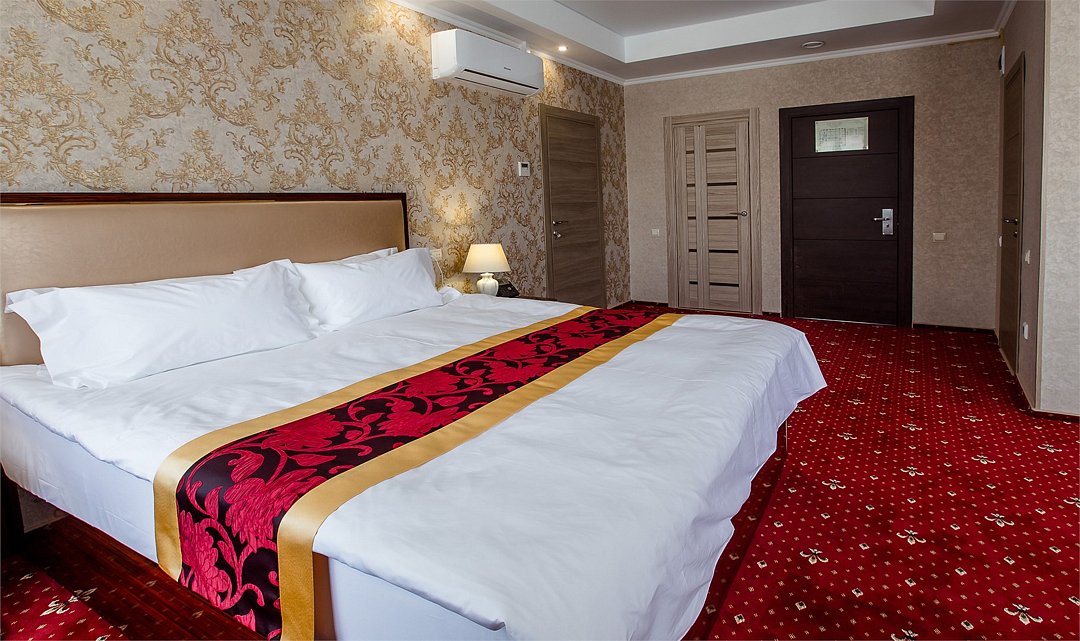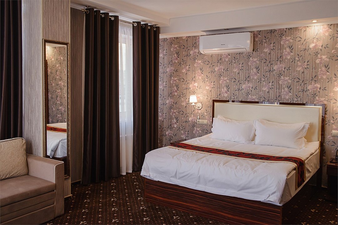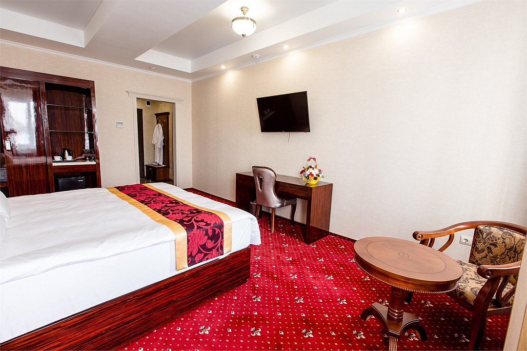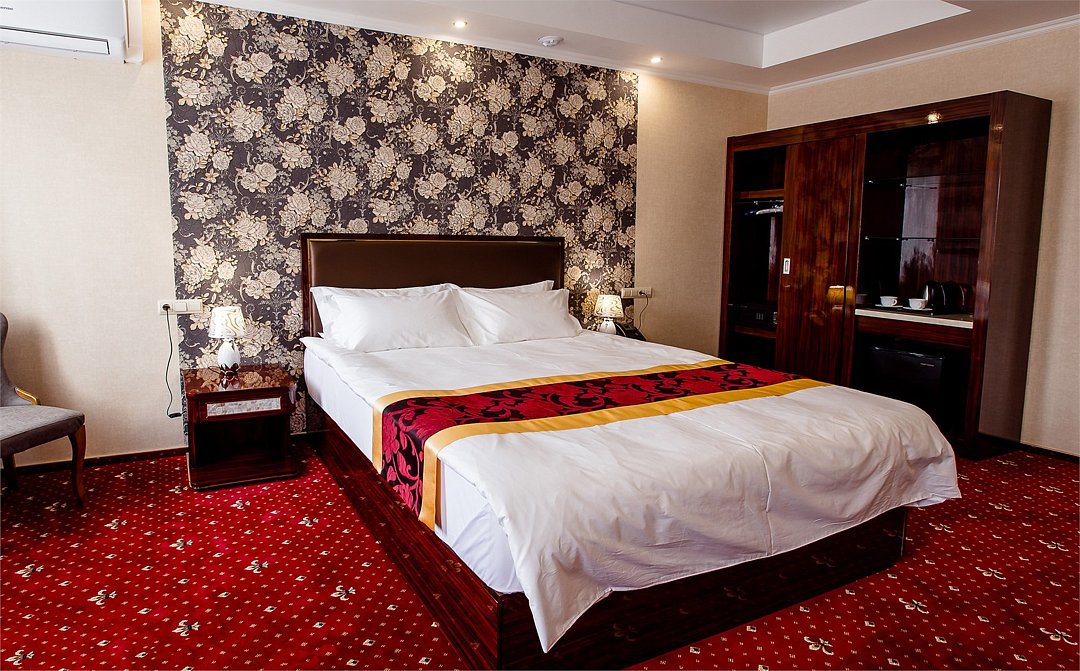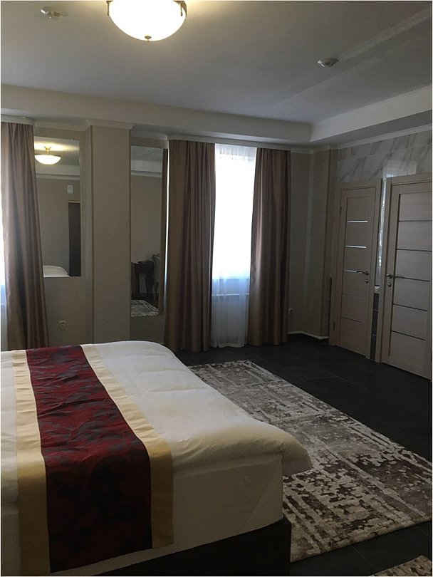 В номерах данной категории есть гардеробные с удобным вместительным шкафом. Среди предметов мебели: мягкий современный диван; причудливое кресло и небольшой классический столик около окна. Ванная комната отделана итальянским кафелем и украшена оригинальными панно. Описание номера «ЛЮКС» с одной двуспальной кроватью • система «Умный дом»; • централизованная система управления климатом; • кровать super king size; • комфортный матрас «Аскона»; • диван; • гардеробная; • телевизор Smart TV с экраном диагональю 43 дюйма; • сейф с электронным замком, зарядные USB-порты у стола и прикроватных тумбочек, • просторная ванная комната с тропическим душем, подогреваемым полом, встроенной в зеркало подсветкой для обеспечения максимального комфорта, фен; • восхитительно мягкие махровые полотенца и халаты, дарящие нежность от прикосновения после расслабляющего душа; • косметические средства RELAX REFRESH REVIVE; • мини-бар с холодильником; • рабочий стол; • журнальный столик с двумя креслами; • питьевая вода, электрический чайник, разные виды кофе и чая.Услуги и удобства