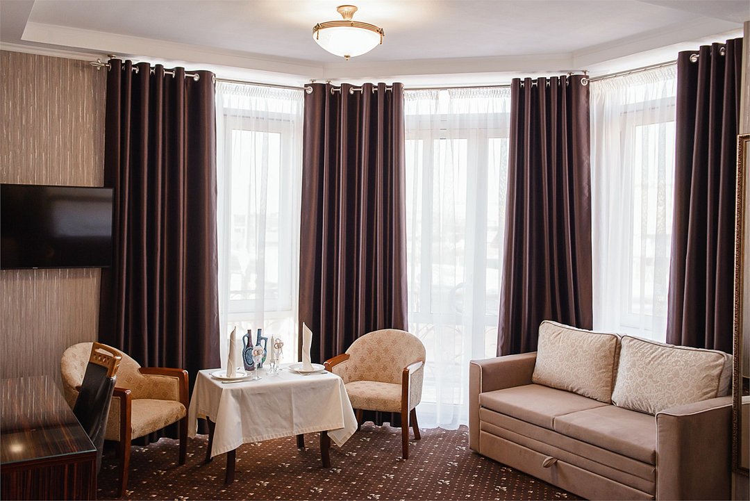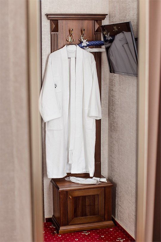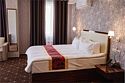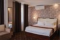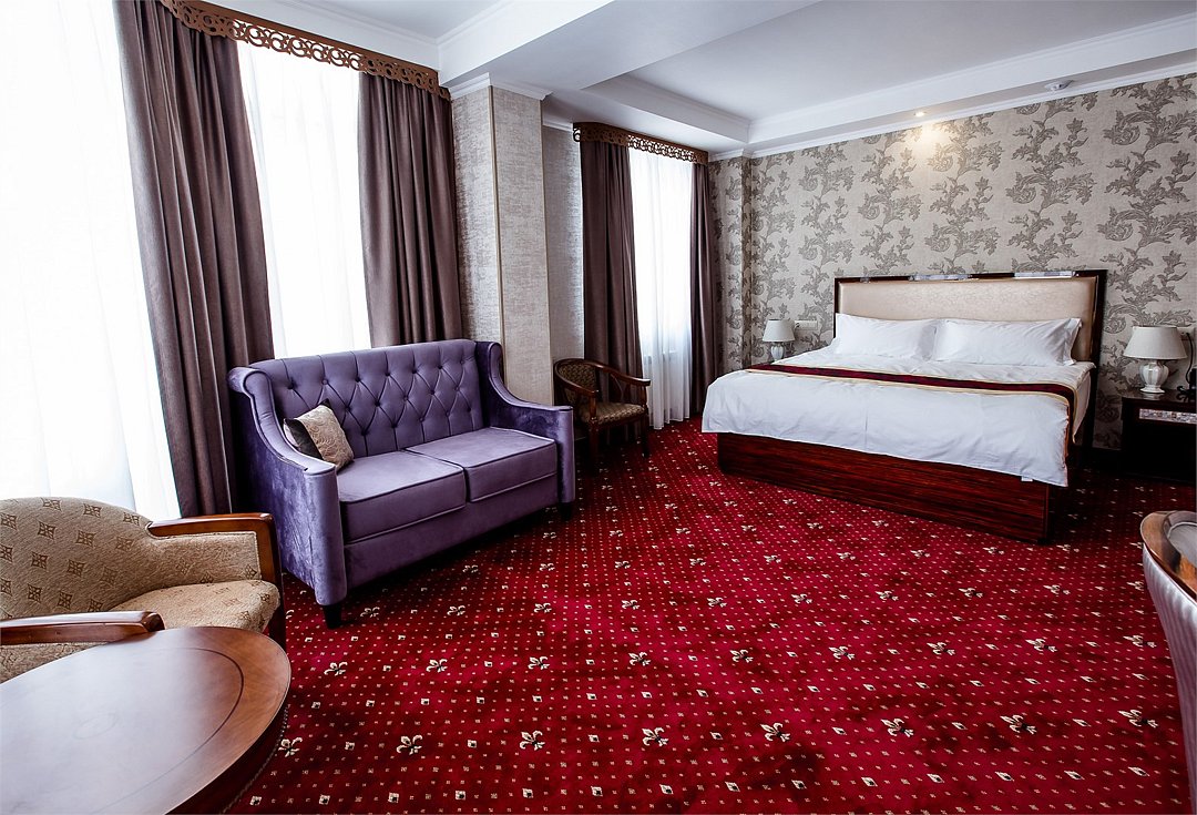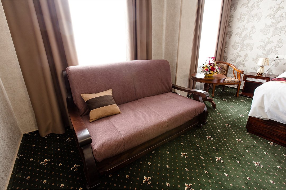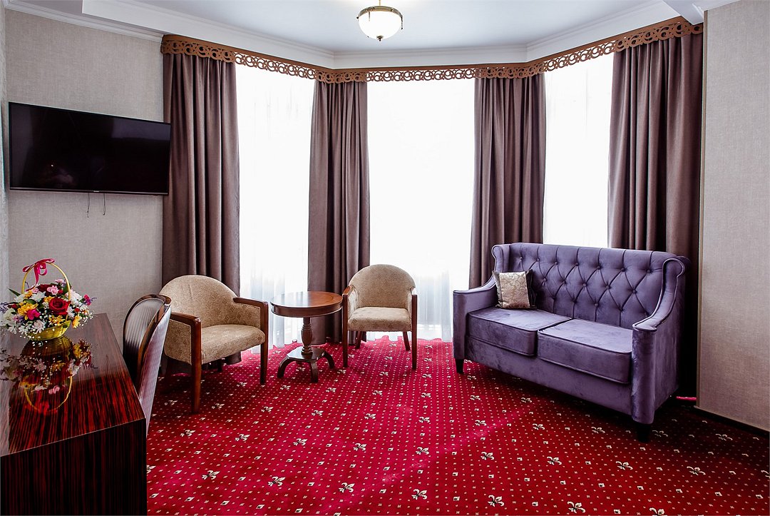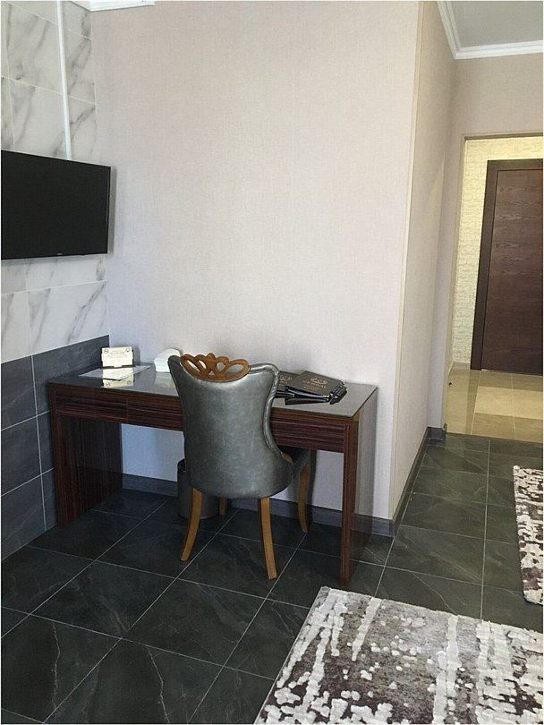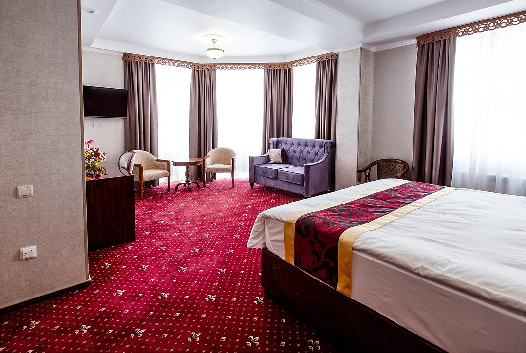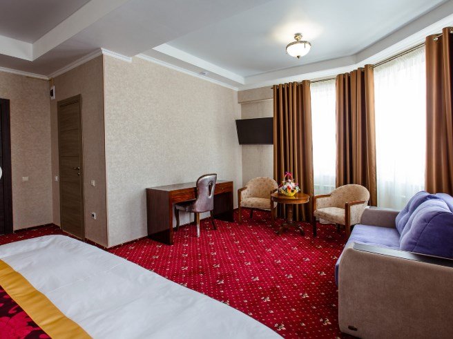 В номерах данной категории есть гардеробные с удобным вместительным шкафом. Среди предметов мебели: мягкий современный диван; причудливое кресло и небольшой классический столик около окна. Ванная комната отделана итальянским кафелем и украшена оригинальными панно. Описание номера «ЛЮКС» с одной двуспальной кроватью • система «Умный дом»; • централизованная система управления климатом; • кровать super king size; • комфортный матрас «Аскона»; • диван; • гардеробная; • телевизор Smart TV с экраном диагональю 43 дюйма; • сейф с электронным замком, зарядные USB-порты у стола и прикроватных тумбочек, • просторная ванная комната с тропическим душем, подогреваемым полом, встроенной в зеркало подсветкой для обеспечения максимального комфорта, фен; • восхитительно мягкие махровые полотенца и халаты, дарящие нежность от прикосновения после расслабляющего душа; • косметические средства RELAX REFRESH REVIVE; • мини-бар с холодильником; • рабочий стол; • журнальный столик с двумя креслами; • питьевая вода, электрический чайник, разные виды кофе и чая.Услуги и удобства