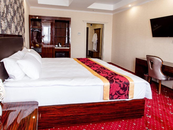 кабельное телевидение, Wi-Fi, интернет, кондиционер, светильник, фен, электронные замки, халаты, банные полотенца, тапочки, гигиенические средства, косметические средства, кровать «King size», двуспальная кровать, ортопедический матрас, тумбы, вешалки, зеркало, мини-бар, чайный набор, набор посуды, сейф, чайник, унитаз, раковина, косметическое зеркало, питьевая вода, ковровое покрытие, отопление, душ, вид на город, кресло, раздельный санузел, столовые приборы, стул, туалетные средства, внутренний телефон, телевизор с плоским экраном, мини-холодильник, москитная сетка, шкаф-купе, телевизор со Smart TV, номер для некурящих, рабочий стол, без питомцевВ номере