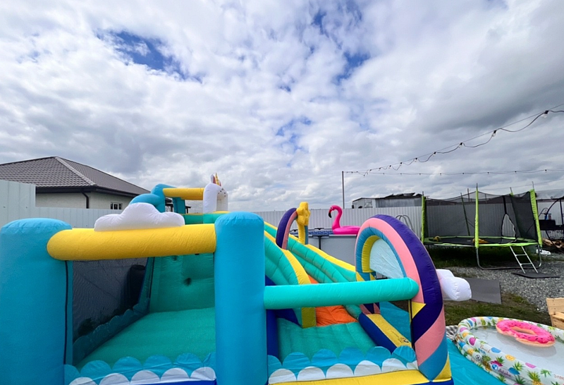 Надувной батут с горкой, скалодромом и сухим бассейном! Он выдерживает 140 кг, это 3-4 ребенка. Размер: 3,0х3,0х2,5 м. Это ведь так классно! Можно спокойно отдыхать и видеть, как дети отрываются, бегают и прыгают!