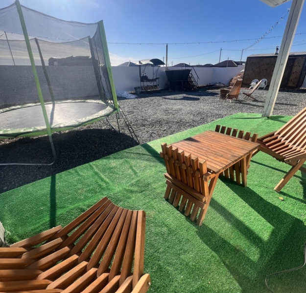 Три отдельные спальни на 6 спальных мест и диван на 2 спальных места. Большой зал для компании на 8 человек. На террасе зона отдыха, мангал с крышей, есть казан, шампура. Укомплектованная кухня со всем необходимым: индукционная плита, холодильник, микроволновая печь, чайник, тостер.