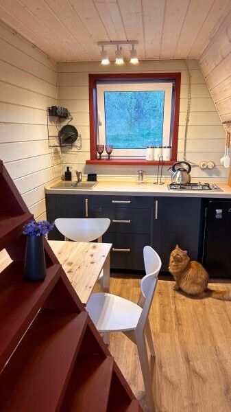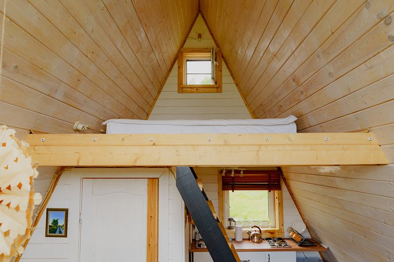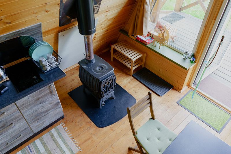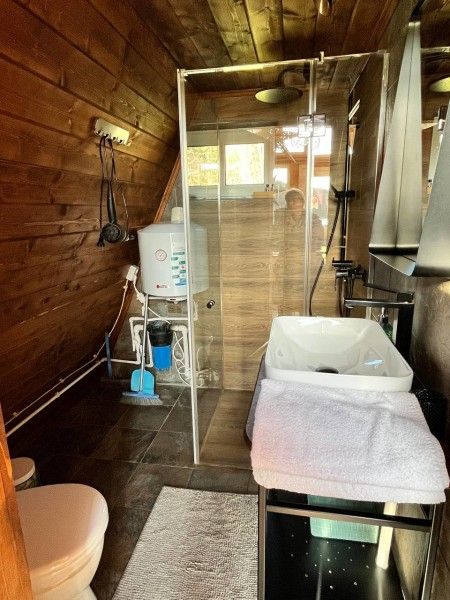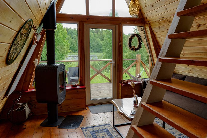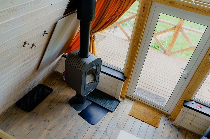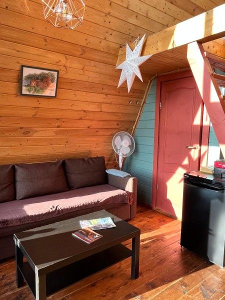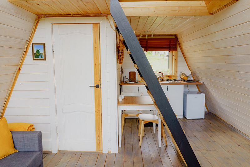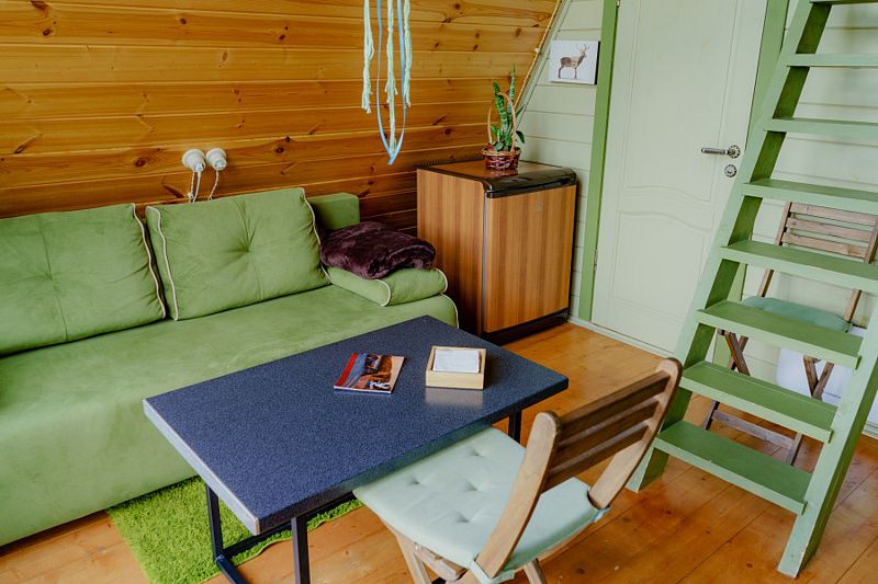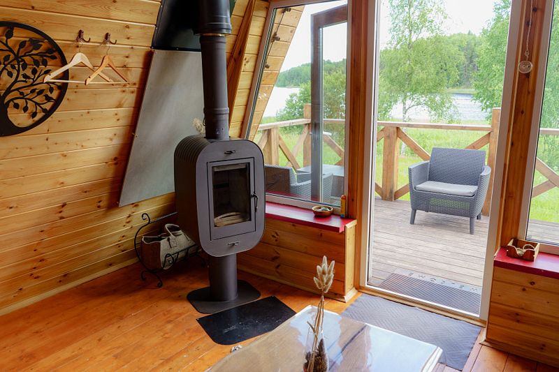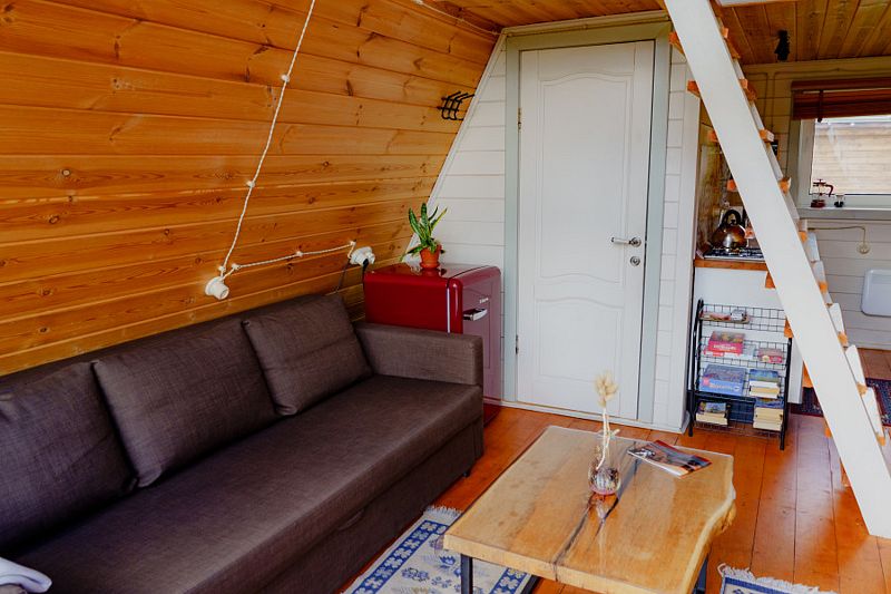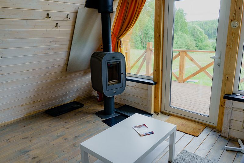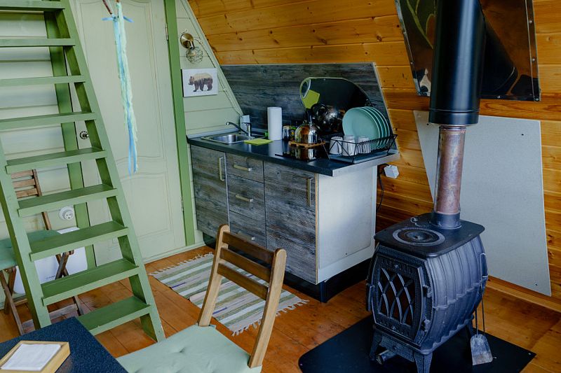 В доме — дровяной камин, душевая кабина и туалет, полноценная кухня со всем необходимым — газовая плита, посуда, холодильник. На первом этаже — раскладной диван, на втором — большое двухспальное место.