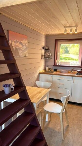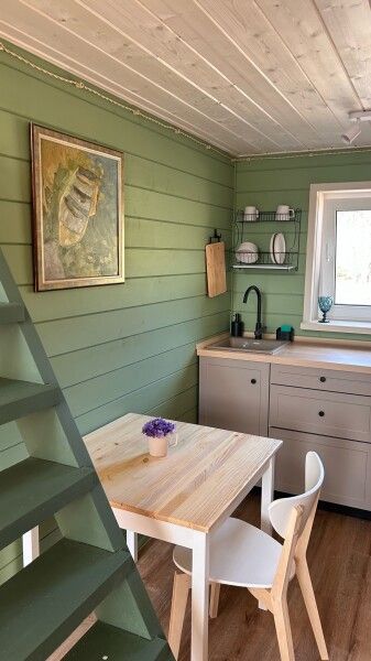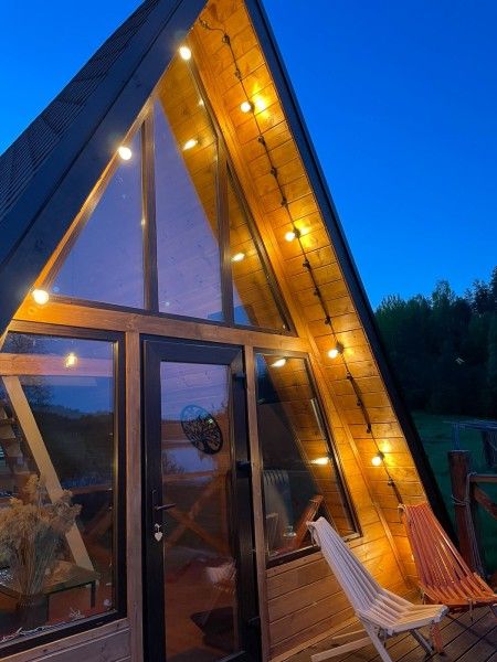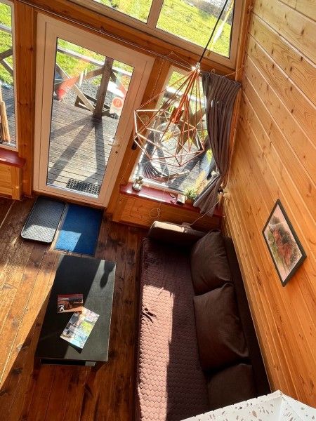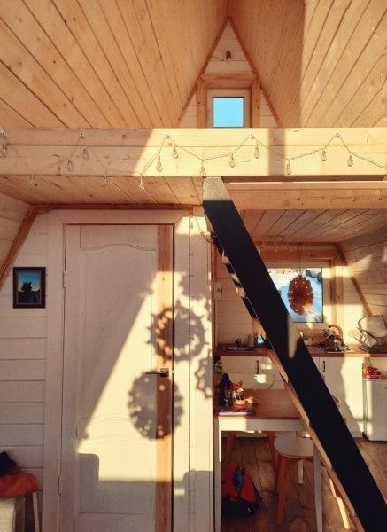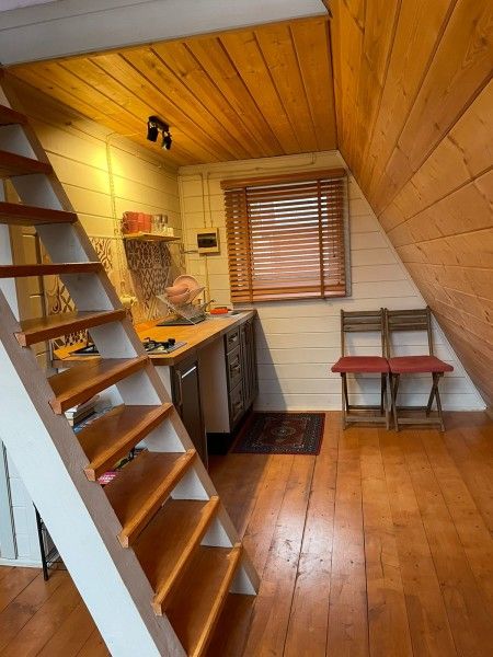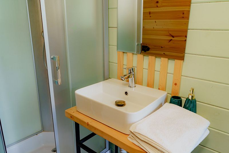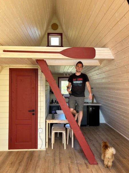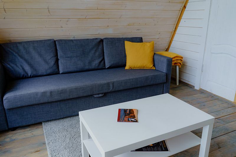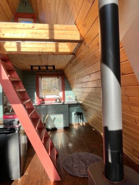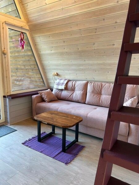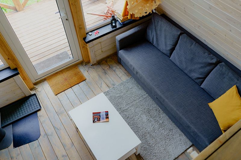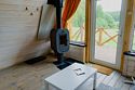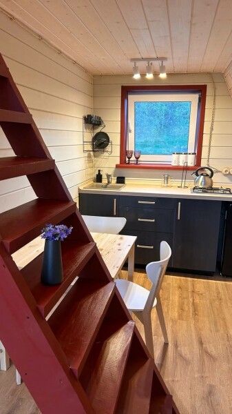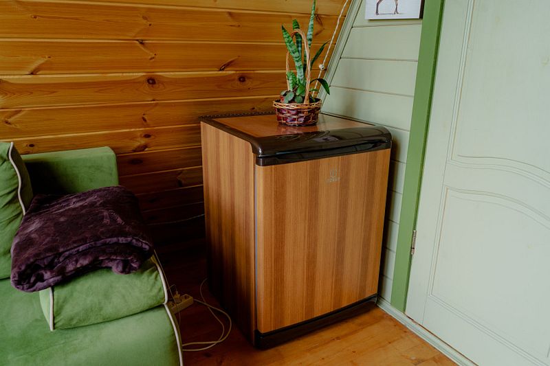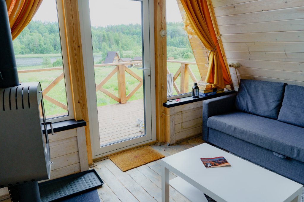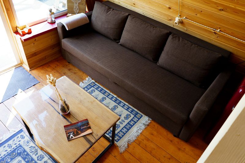 В доме — дровяной камин, душевая кабина и туалет, полноценная кухня со всем необходимым — газовая плита, посуда, холодильник. На первом этаже — раскладной диван, на втором — большое двухспальное место.