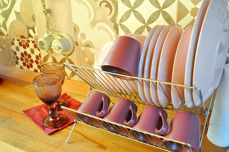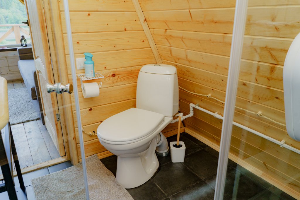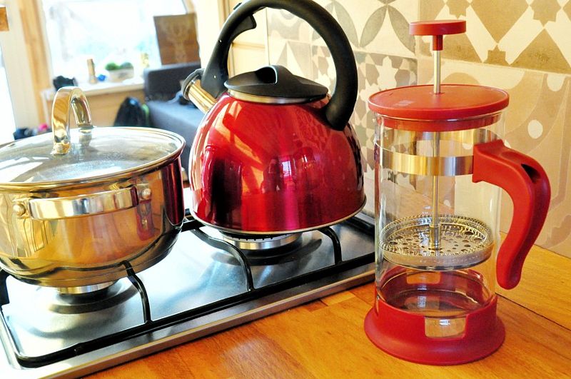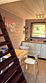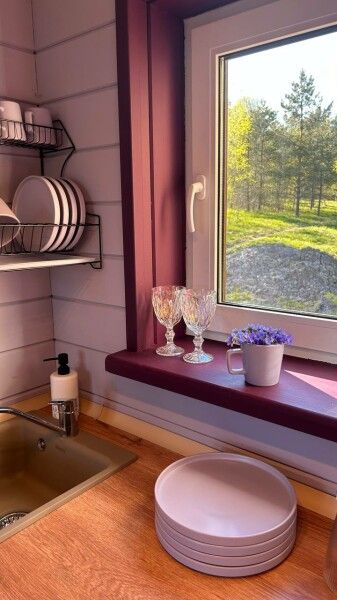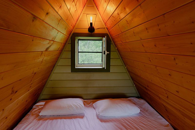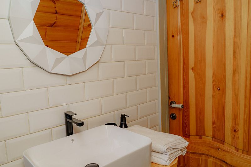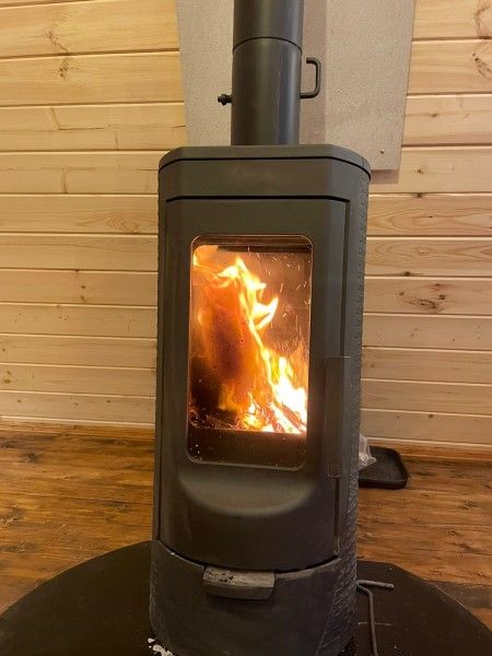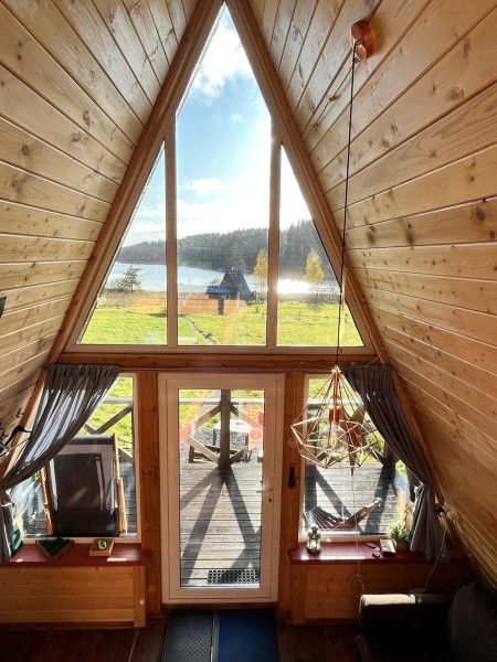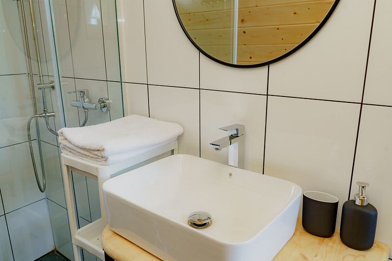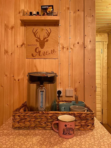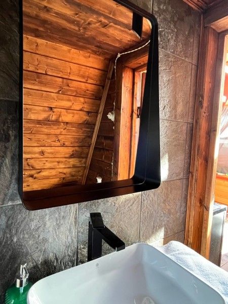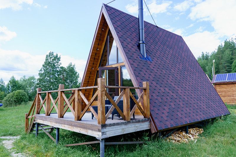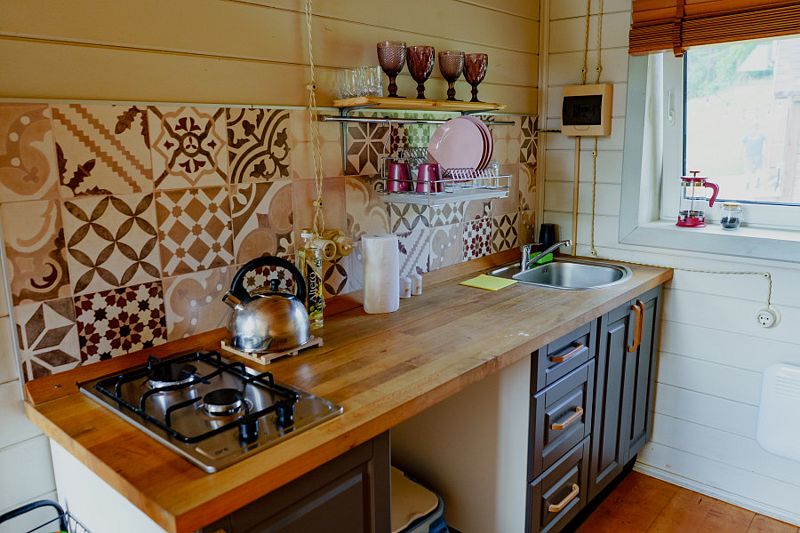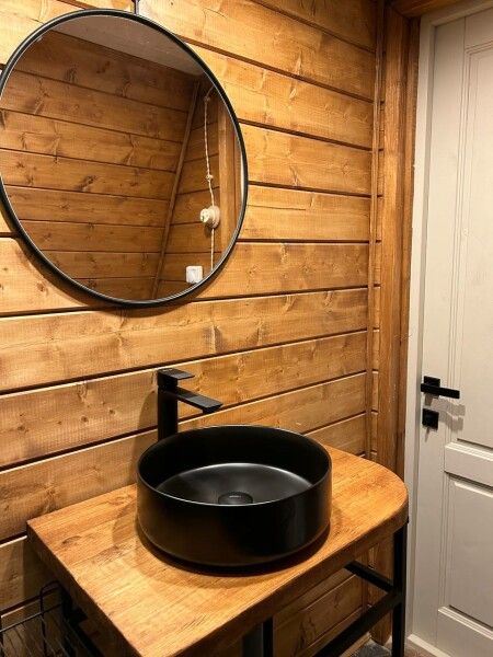 В доме — дровяной камин, душевая кабина и туалет, полноценная кухня со всем необходимым — газовая плита, посуда, холодильник. На первом этаже — раскладной диван, на втором — большое двухспальное место.