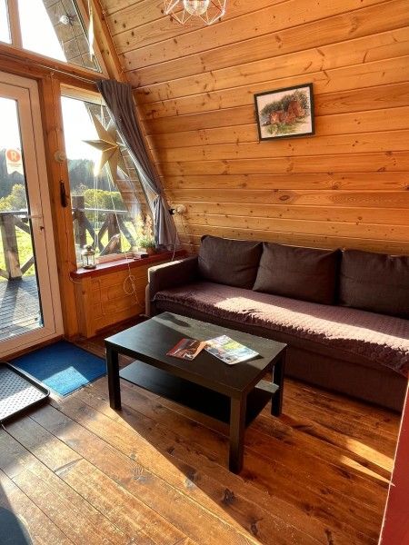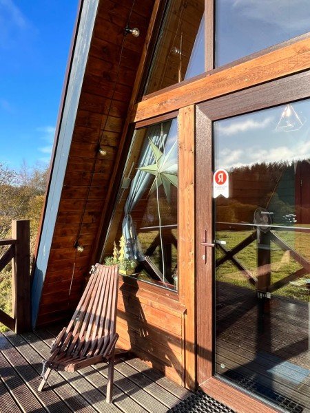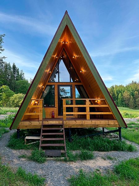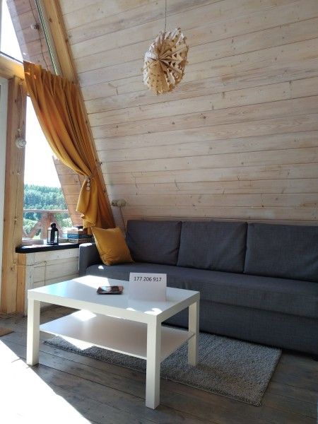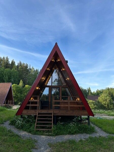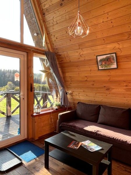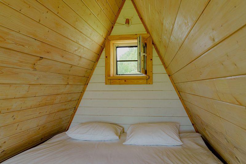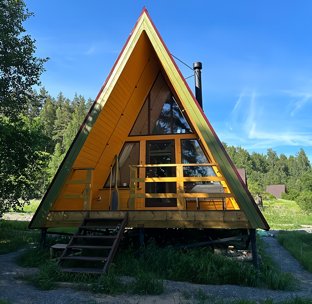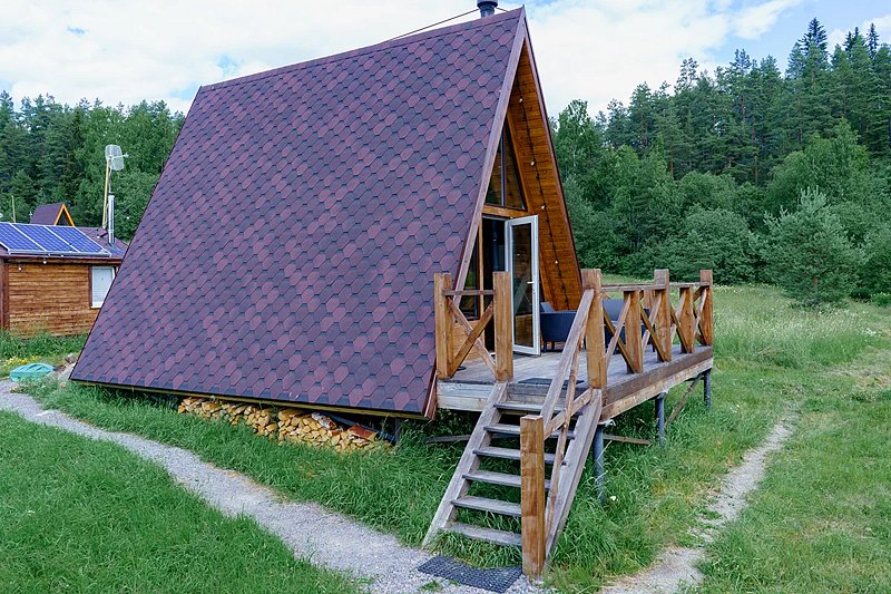 Двухэтажный 6-местный дом. Дровяной камин, душевая кабина и туалет, полноценная кухня с газовой плитой, посуда, холодильник. На первом этаже — раскладной диван и отдельная спальня с двумя кроватями, на втором — большое двухспальное место.