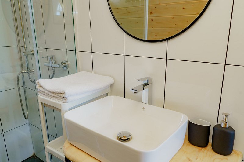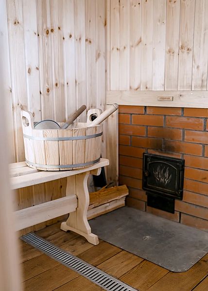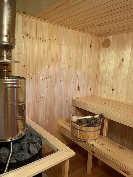 Уютная баня на 4 человек. Находится на берегу озера, в которое можно нырнуть прямо с пирса. Предоставляется все необходимое для парения: простыни, чай, эфирные масла — бесплатно.