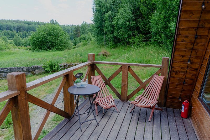 У каждого дома - большая терраса с удобными креслами, где можно с комфортом отдохнуть, и собственная мангальная зона со всем необходимым — дрова, решетки шампуры — все включено.