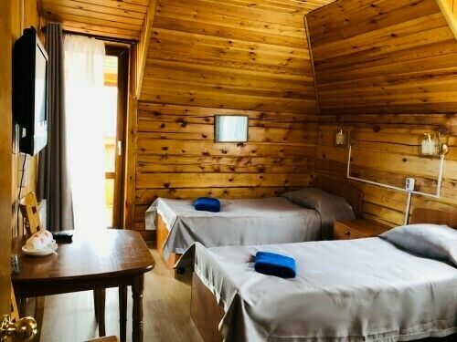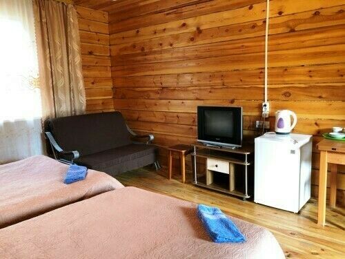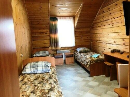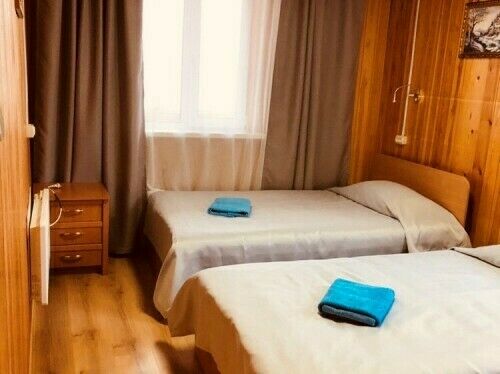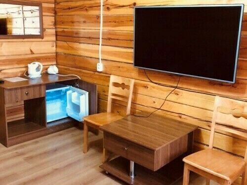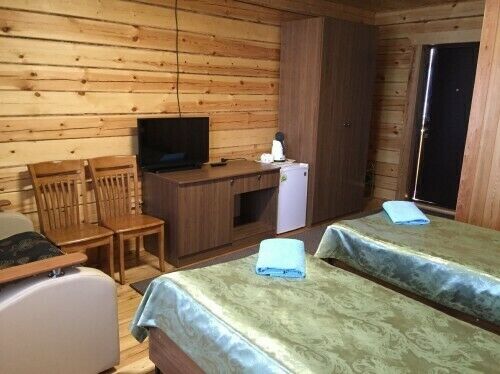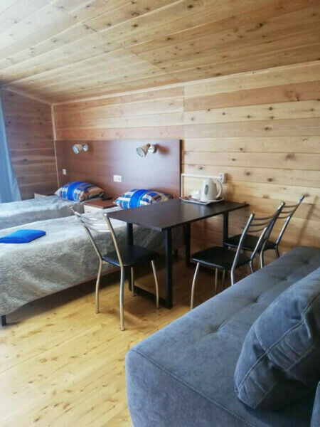 В номере: четыре раздельные односпальные кровати, шкаф, тумбочки, настенный электрообогреватель, стулья, журнальный столик, ТВ, чайник, холодильник.