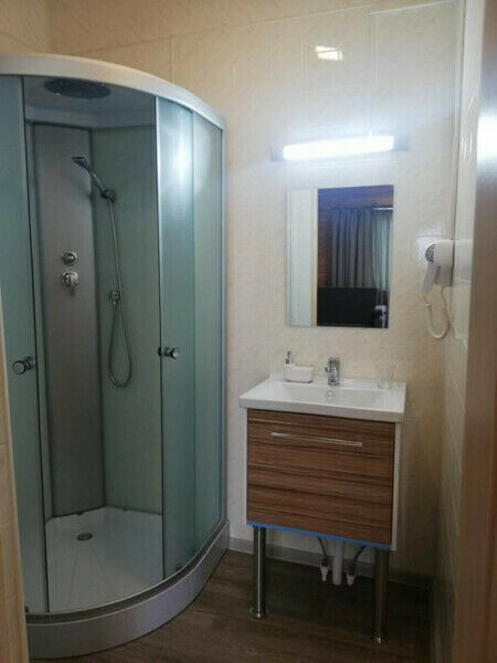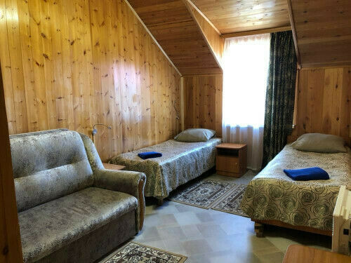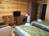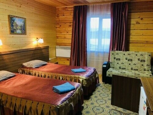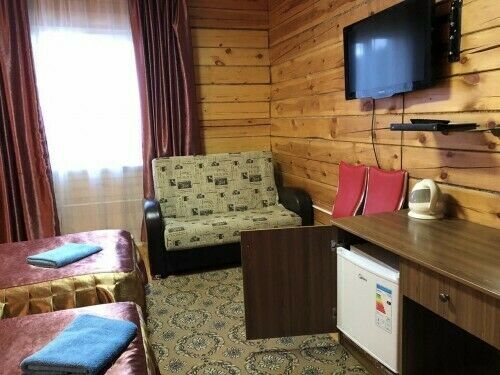 В номере: две раздельные односпальные кровати, 1,5 спальный раздвижной диван, шкаф, тумбочки, настенный электрообогреватель, стулья, журнальный столик, ТВ, чайник, холодильник.