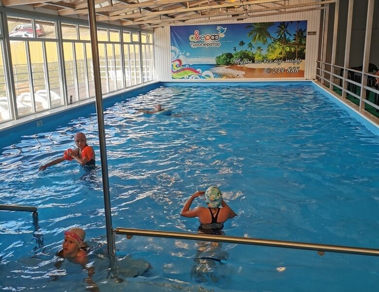 Режим работы бассейна: с июня по август. Бассейн имеет 3 зоны глубины, так что даже самые маленькие могут поплавать в бассейне. Для удобства отдыхающих вокруг бассейна стоят шезлонги и столики.