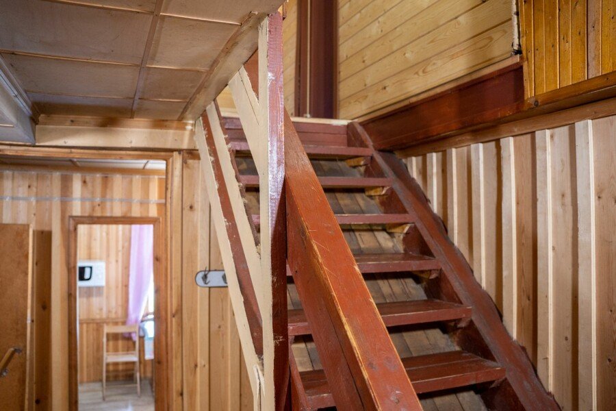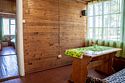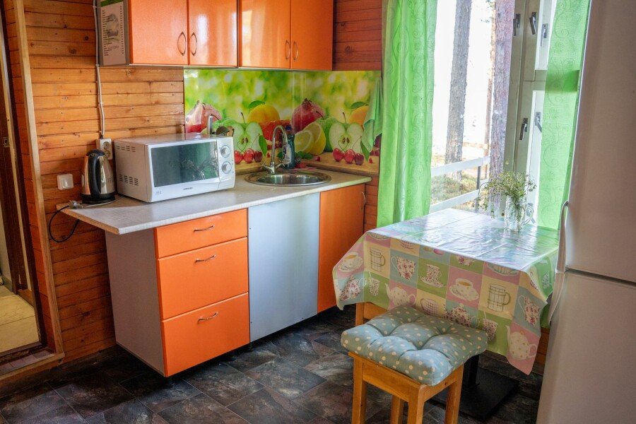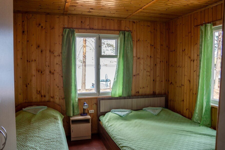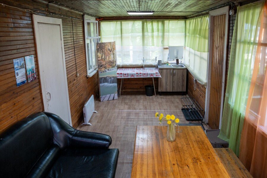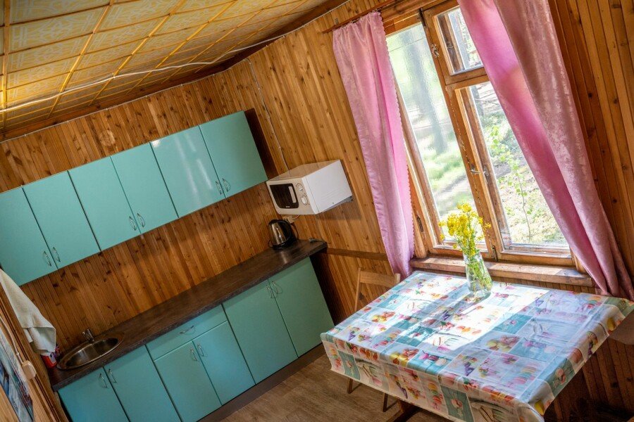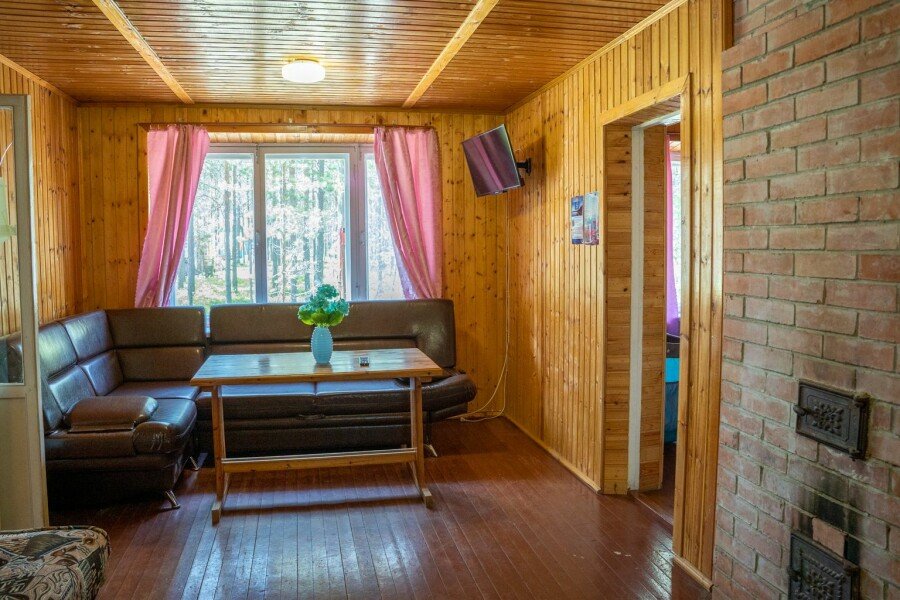 Дом у озера на две секции, расположен в десяти метрах от пляжа. Каждая секция с отдельным входом, где крытая веранда, кухня и комната. На веранде летний умывальник с раковиной, зона отдыха и раскладной диван, кухня с печкой, где есть все необходимое для приготовления еды (плита, холодильник, чайник, посуда) и спальня, где одна двуспальная и одна односпальная кровать.