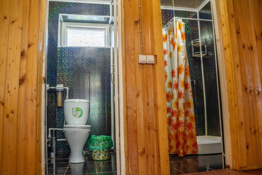 Благоустроенный душ и туалет на улице рядом с домом примерно в пятнадцати метрах от секции. Постельное белье, полотенца и вся необходимая посуда в домике. Отопление — конвекторы в спальне, за дополнительную плату можно взять обогреватель.