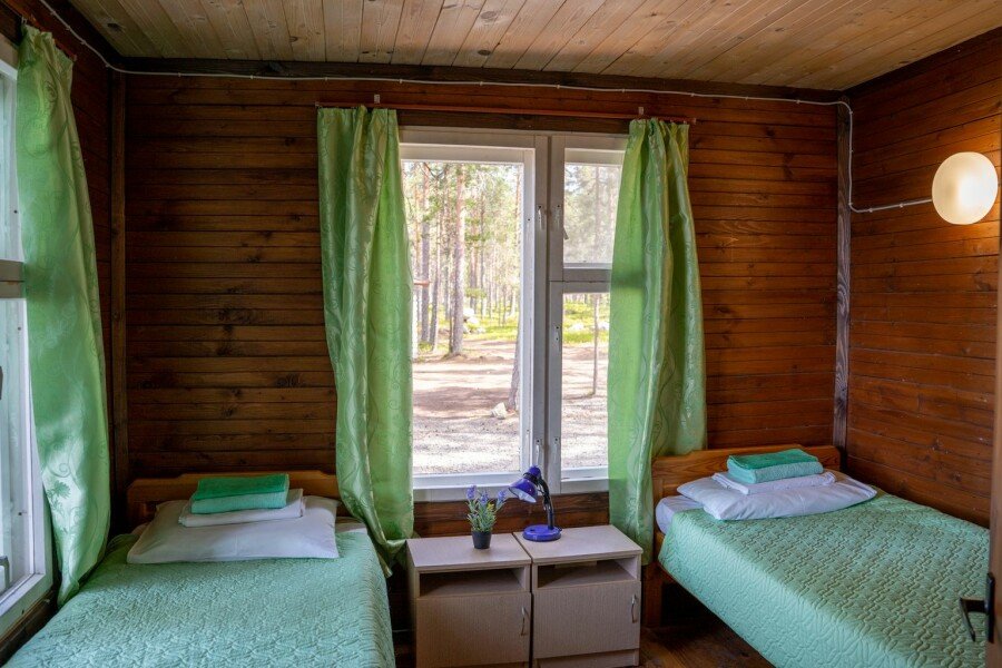 Летние апартаменты с отдельным входом, где летняя веранда и просторная комната, расположены в десяти метрах от песчаного пляжа. Каждая секция апартаментов представляет собой веранду с мини-кухней, где есть все необходимое для приготовления еды (плита, холодильник, чайник, посуда) и спальню с четырьмя раздельными кроватями и красивейшим видом на озеро.