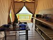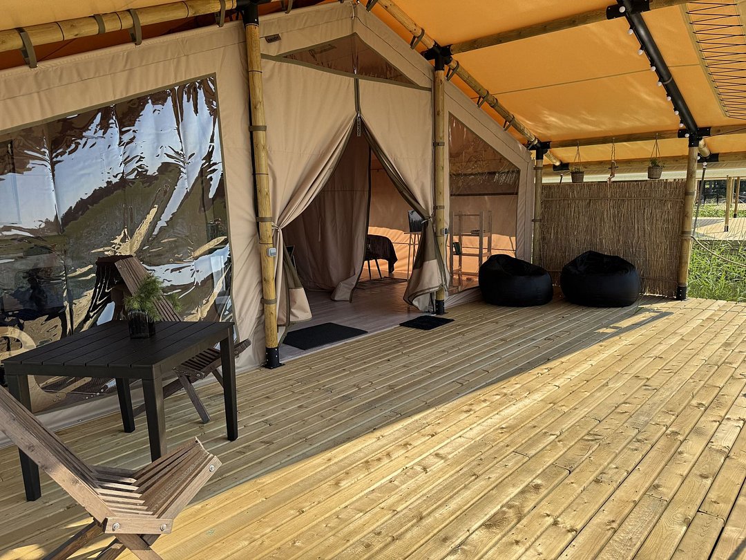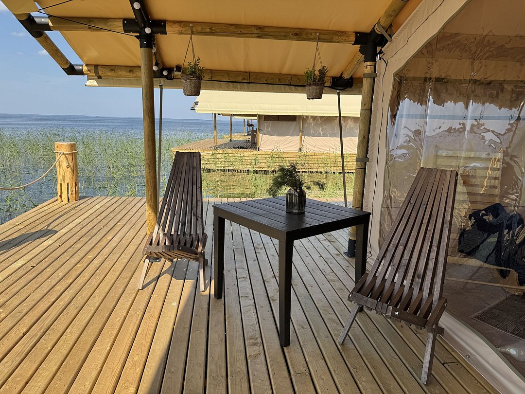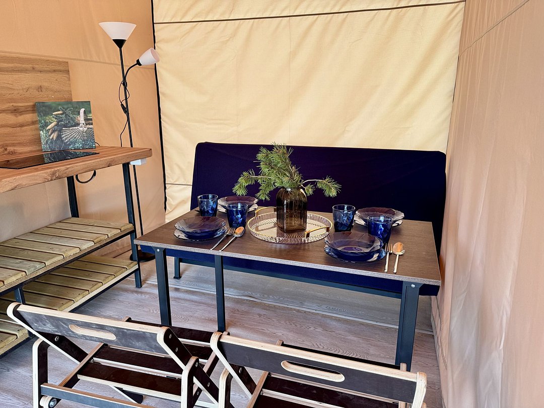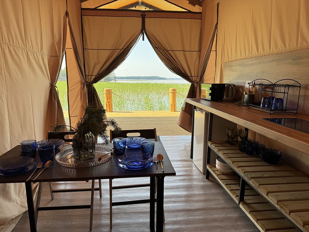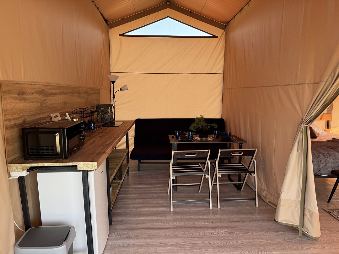 Рядом с шатром находится мангал, также предоставляются постельное белье и полотенца. Вместимость составляет от двух до четырех человек. У каждого глэмпинга есть открытая терраса с видом на потрясающие закаты и восходы.