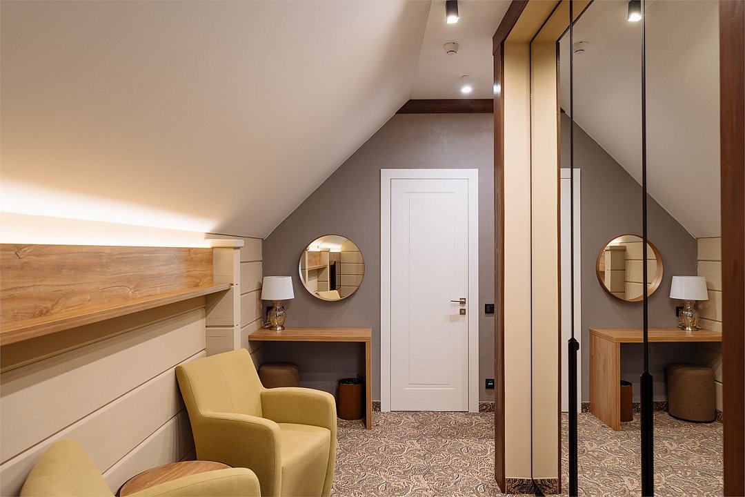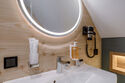 - на втором этаже коттеджа находятся 2 спальни с двуспальными кроватями, в каждой спальне есть отдельная ванная комната с мансардным окном и просторным душем;