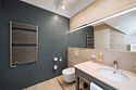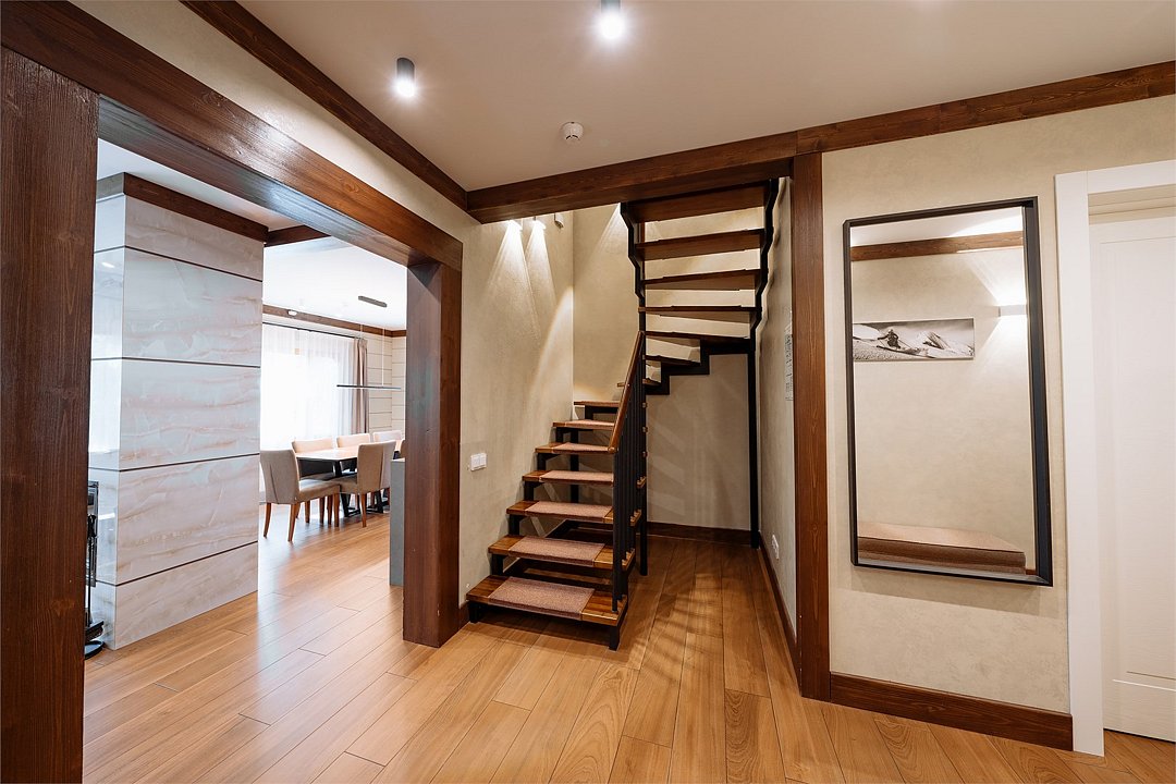 - на первом этаже коттеджа расположены современная кухня с премиальной техникой NEFF Liebherr, гостиная с камином, телевизором и обеденной зоной, терраса, сауна, сушильный шкаф, а также спальня с двумя раздельными кроватями и собственной ванной комнатой;