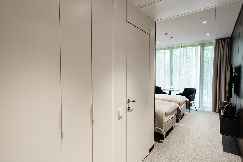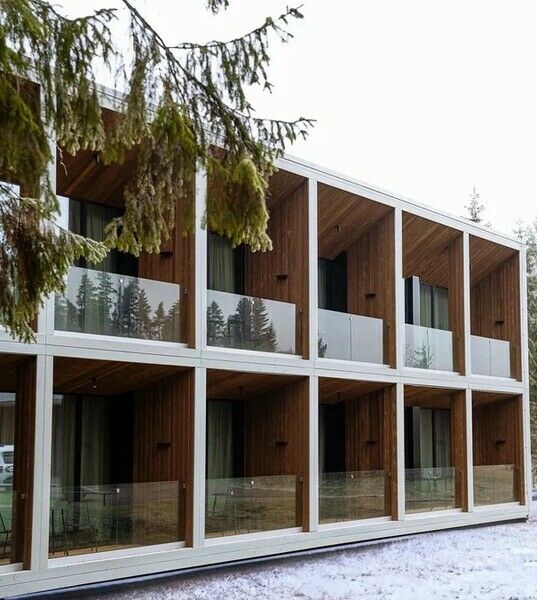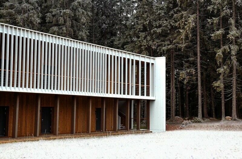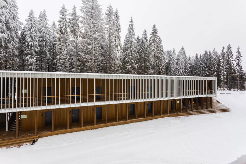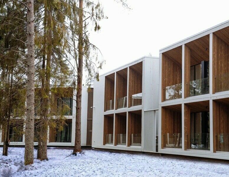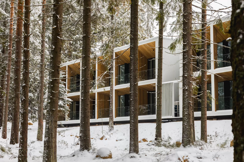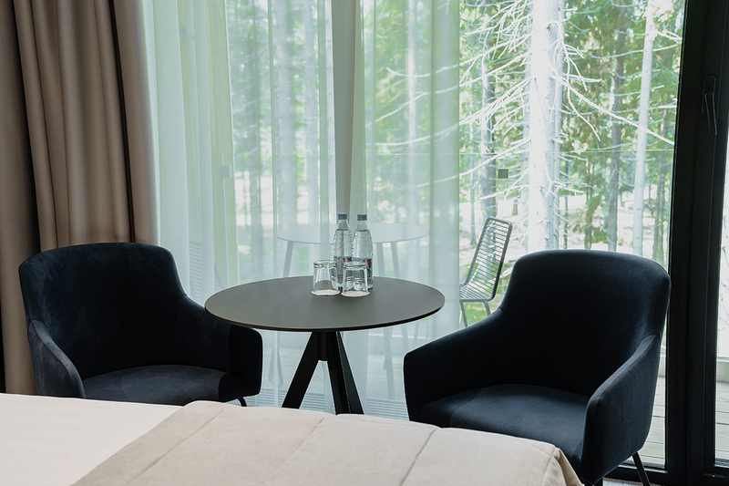 Каждый номер имеет выход на собственную террасу со столиком и креслами с видом на сосновый лес.