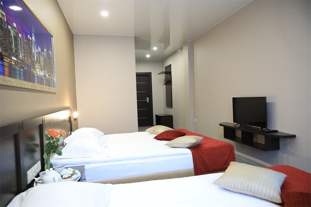 телевизор, Wi-Fi, кондиционер, фен, электронные замки, ванная комната, халаты, банные полотенца, тапочки, две односпальные кровати, шкаф для одежды, вешалки, багажная тумба, зеркало, информационная карта, меню, питьевая вода, ковровое покрытие, душ, кулер на этаже, высокие потолки, стаканы, стул, стол, мини-холодильник, москитная сетка, гостиничная парфюмерияВ гостиничном номере