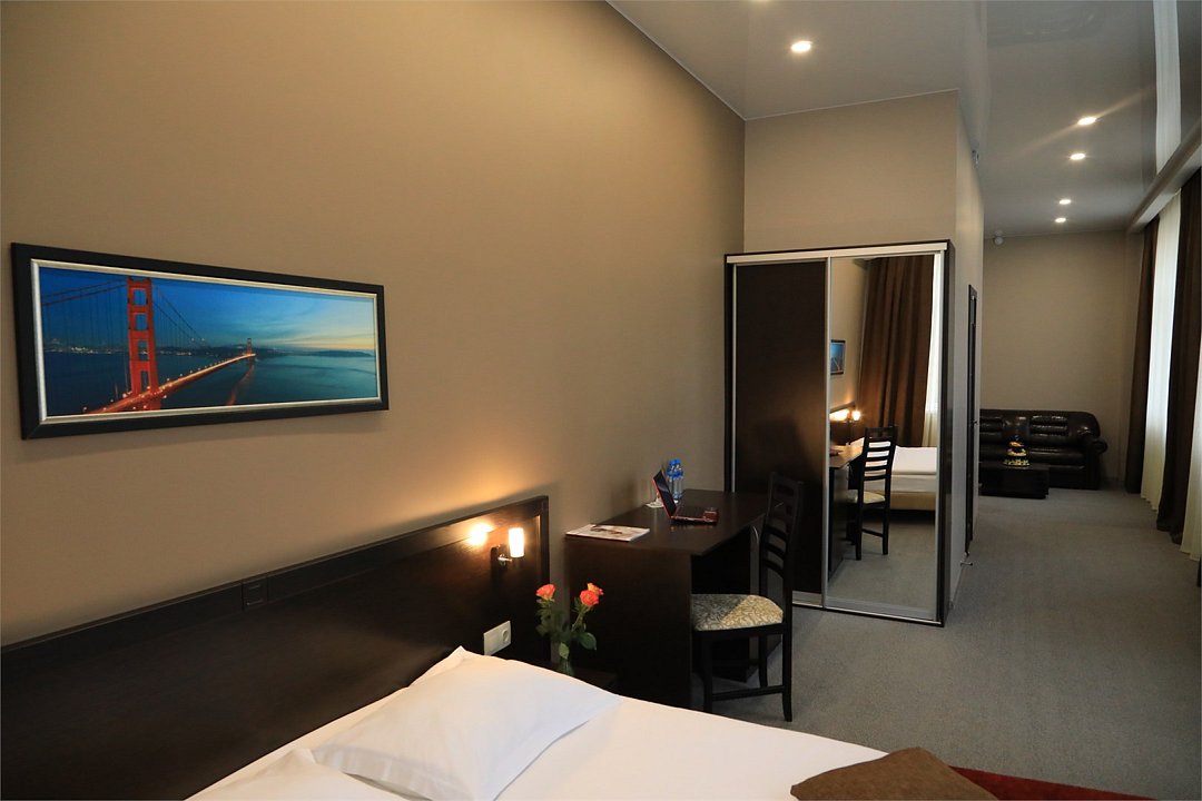 Просторный двухкомнатный номер, площадью 45 кв.м., состоящий из спальни с большой кроватью, удобной гостиной, оснащенный современной стильной мебелью. Идеальный вариант для бизнес-туристов.Услуги и удобства
