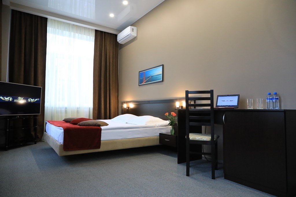 телевизор, Wi-Fi, кондиционер, светильник, фен, электронные замки, ванная комната, халаты, банные полотенца, тапочки, двуспальная кровать, тумбы, стулья, шкаф для одежды, вешалки, письменный стол, багажная тумба, зеркало, информационная карта, меню, питьевая вода, ковровое покрытие, душ, кулер на этаже, высокие потолки, стаканы, стул, стол, мини-холодильник, москитная сетка, гостиничная парфюмерияВ гостиничном номере