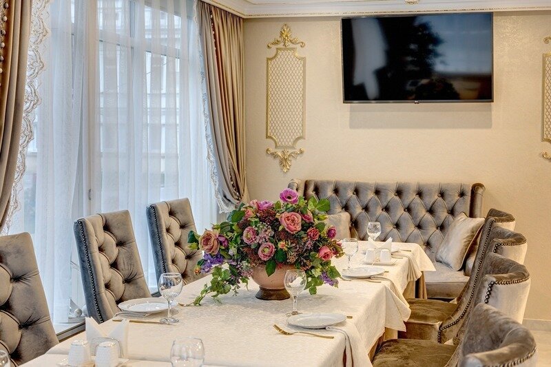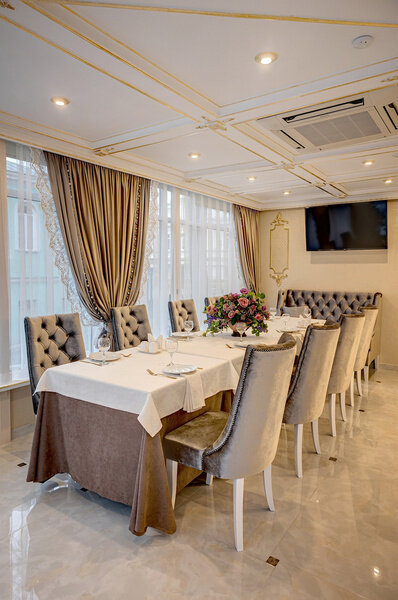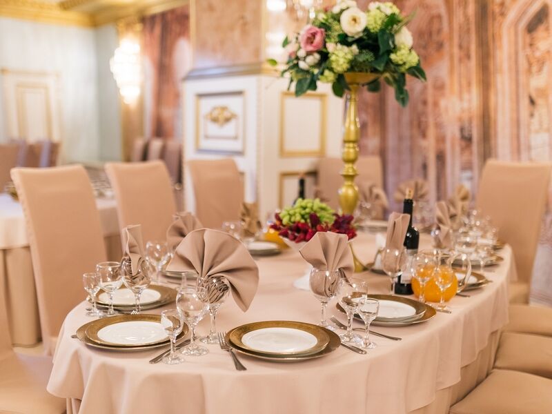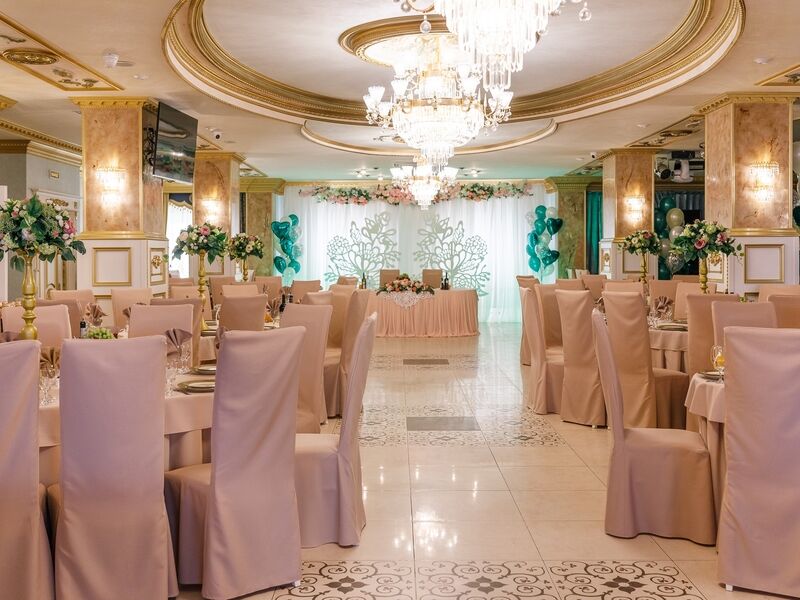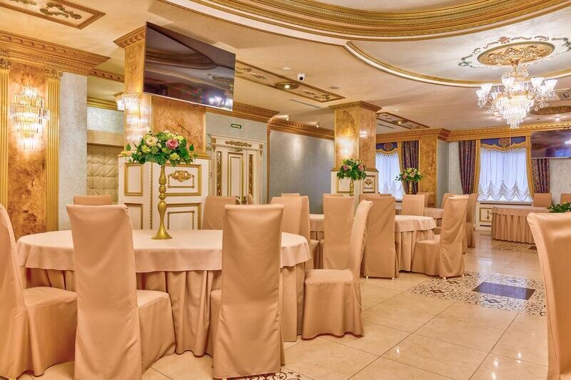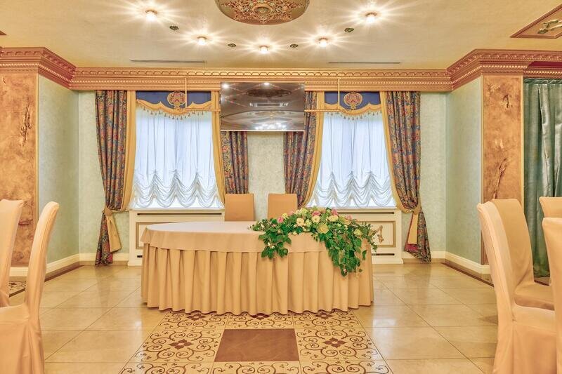 Банкетный зал выполнен в светлых тонах в торжественном стиле и не требует дополнительного оформления. Для небольших мероприятий есть отдельные залы.
