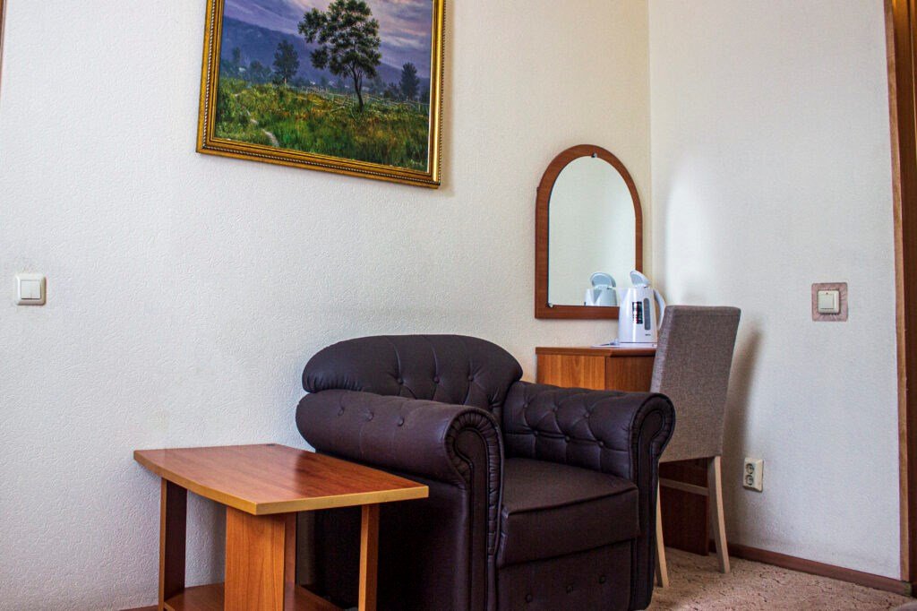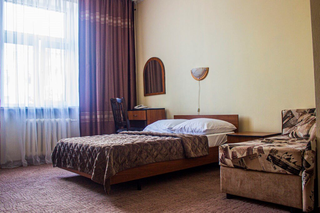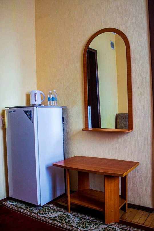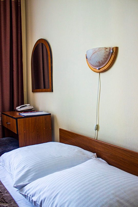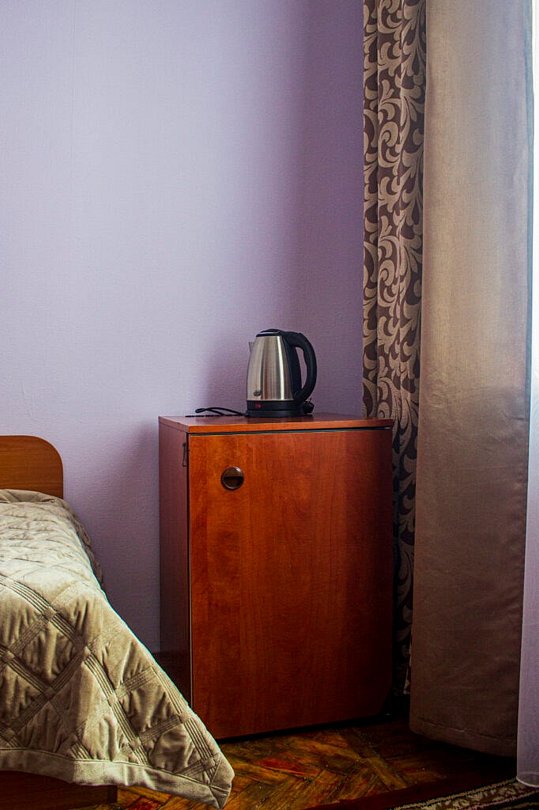Одноместный номер, однокомнатный площадью 21 м². Оборудование и оснащение в соответствии с категорией, набор мебели с кроватью, телевизор, холодильник, телефон, чайник, полный санузел 2,4 м² с душевой кабиной.Услуги и удобства