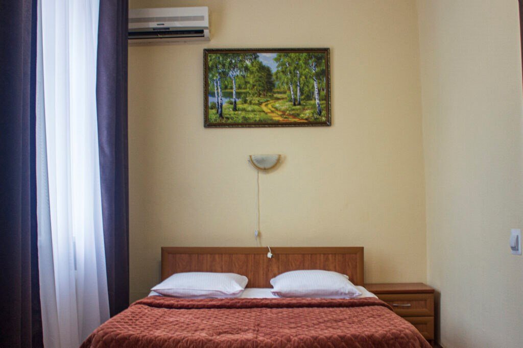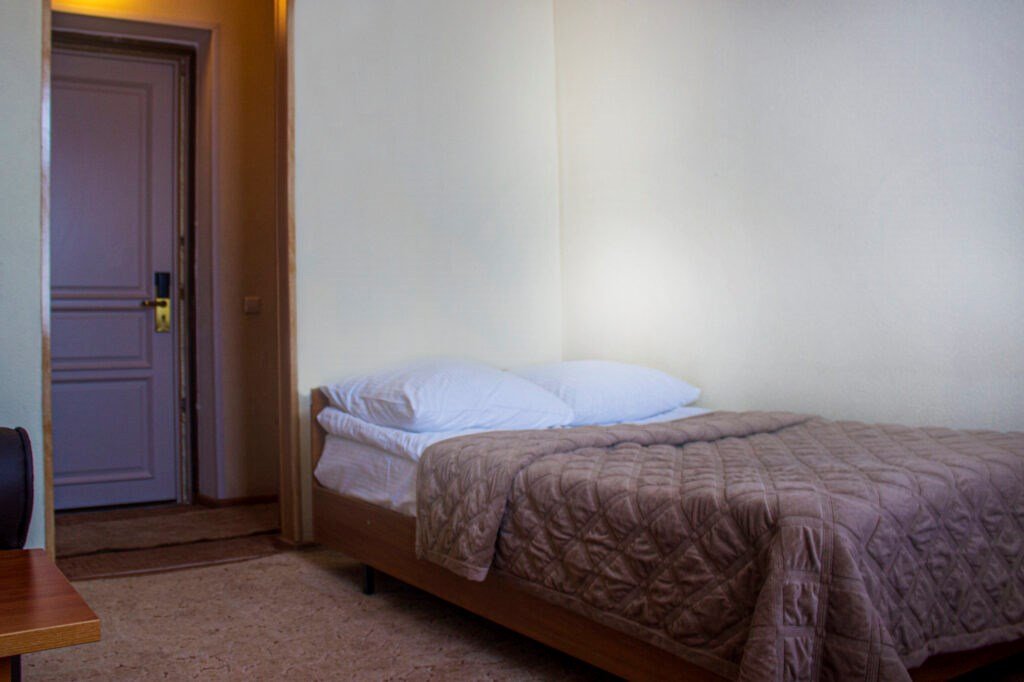 Одноместный номер, однокомнатный площадью 14 м². Оборудование и оснащение в соответствии с категорией — набор мебели с кроватью 90х200 см, телевизор, холодильник, телефон, полный санузел 2,4 м².Услуги и удобства