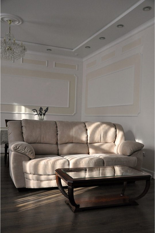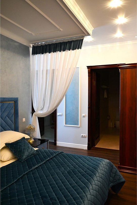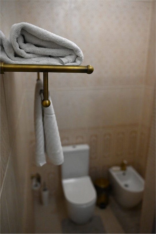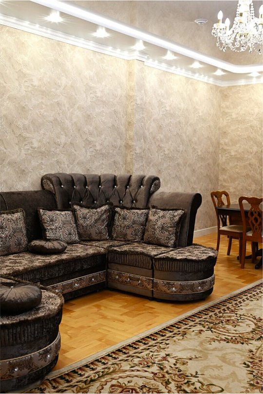 Просторный номер общей площадью 115 м², четыре комнаты — большая прихожая, просторная гостиная с диваном и большим обеденным столом со стульями, две спальных комнаты с двуспальными кроватями. Оборудование и оснащение в соответствии с категорией — набор мебели, набор посуды, чайник, два кондиционера, три телевизора, холодильник, телефон, два полных санузла по 6 м² каждый.Услуги и удобства