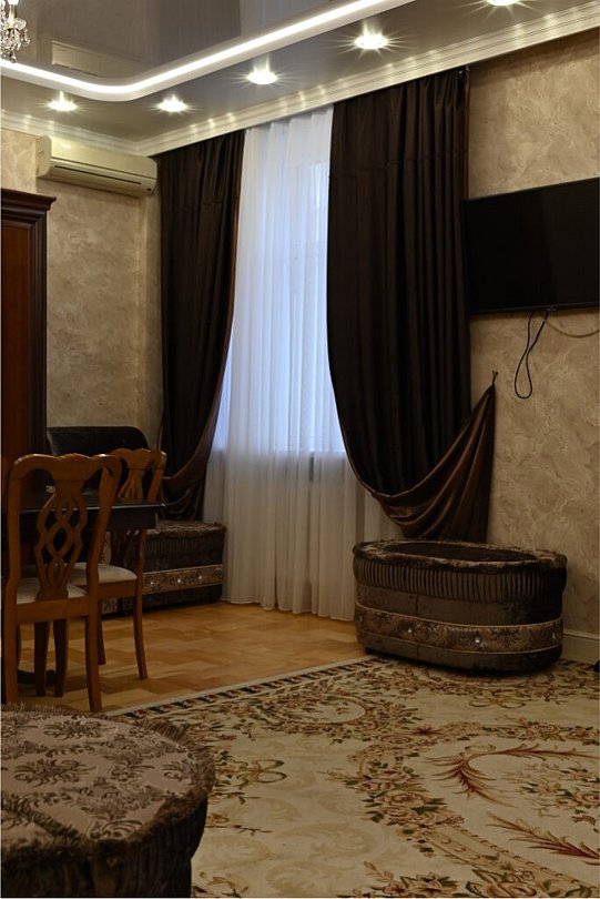 два телевизора, кабельное телевидение, Wi-Fi, холодильник, кондиционер, светильник, фен, ванна, биде, халаты, банные полотенца, тапочки, гигиенические средства, двуспальная кровать, диван, тумбы, стулья, шкаф для одежды, вешалки, журнальный столик, письменный стол, стол для переговоров, зеркало, ковер, письменные принадлежности, набор посуды, сейф, чайник, унитаз, раковина, питьевая вода, гостиная зона, ковровое покрытие, три комнаты, высокие потолки, стаканы, столовые приборы, туалетный столик, внутренний телефон, услуги прачечной (платно), вешалки-плечики, бутилированная вода, шапочка для душа, затемняющая штора, можно с питомцамиВ гостиничном номере