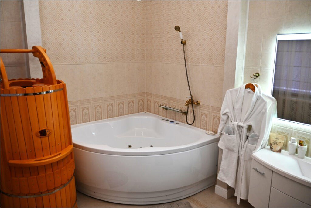 Одноместный номер общей площадью 52м², две комнаты — большая прихожая, просторная гостиная и спальная комнаты. Оборудование и оснащение в соответствии с категорией — набор мебели с двуспальной кроватью, кондиционер, телевизор, холодильник, чайник, телефон, полный санузел 6 м².Услуги и удобства