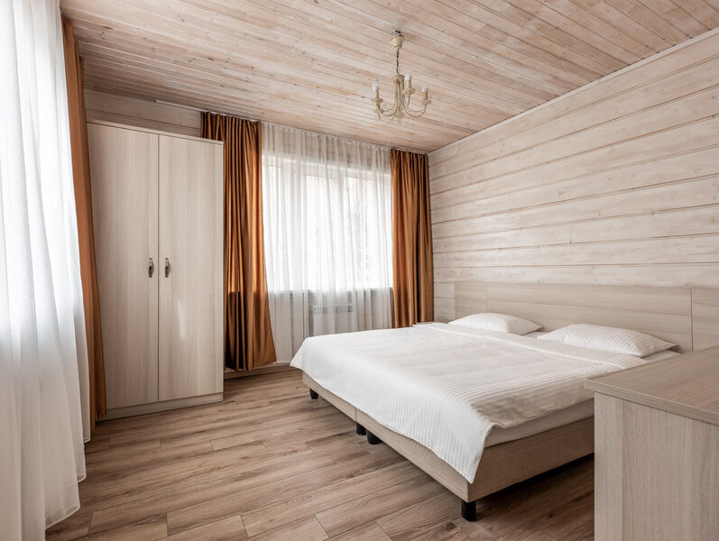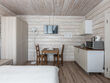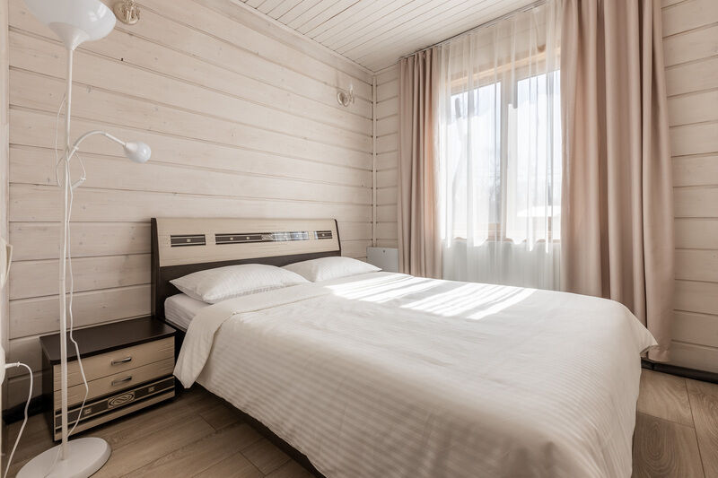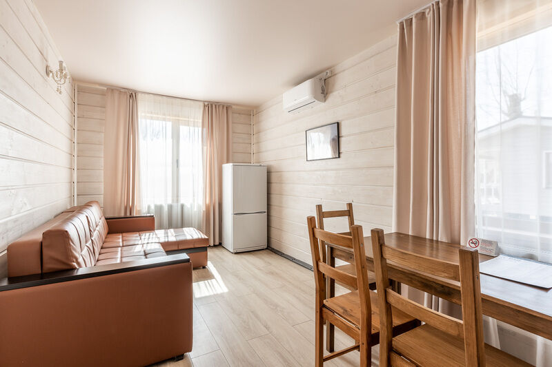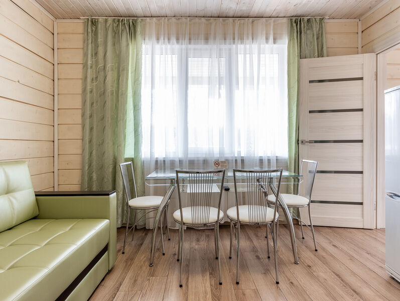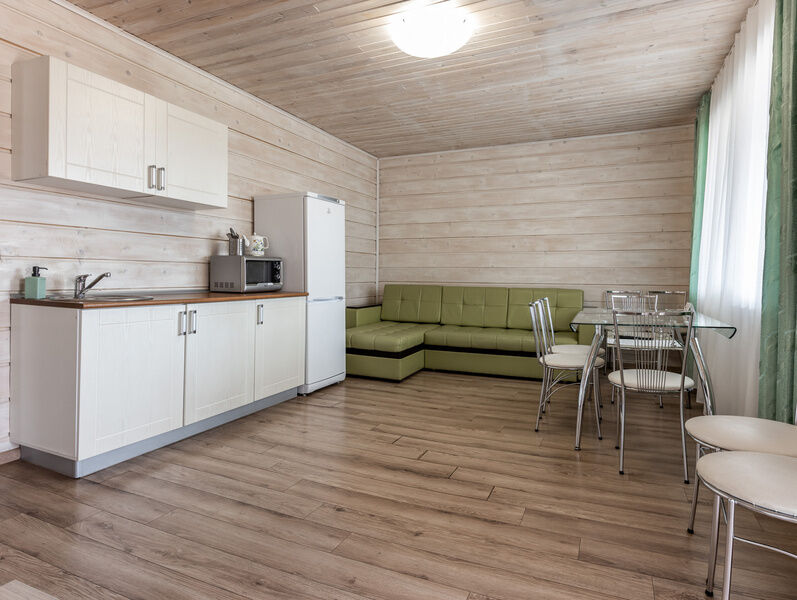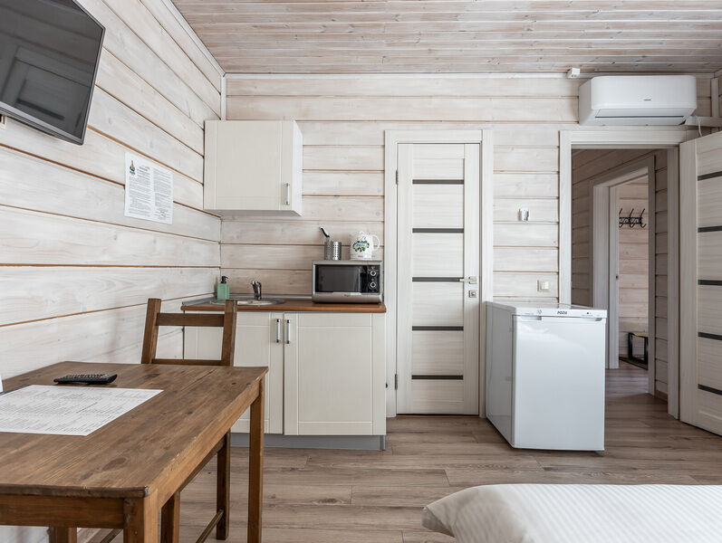 двухкомнатный отапливаемый финский дом. Вместимость номера: 2 основных спальных места + 2 спальных места на раскладном диване с комплектом постельного белья и полотенец. Оснащение: Уютная спальня с двуспальной кроватью, прикроватными тумбочками, шкафом, кондиционером. Санузел с душевой кабиной. Кухня-гостиная с микроволновой печью, холодильником, варочной поверхностью, электрическим чайником, посудой, комфортным раскладным диваном. Открытая беседка и мангальная зона напротив входа.