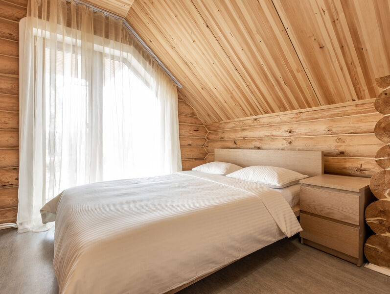 двухкомнатный отапливаемый финский дом. Вместимость номера: 2 основных спальных места + 2 спальных места на раскладном диване с комплектом постельного белья и полотенец. Оснащение: Уютная спальня с двуспальной кроватью, прикроватными тумбочками, шкафом, кондиционером. Санузел с душевой кабиной. Кухня-гостиная с микроволновой печью, холодильником, варочной поверхностью, электрическим чайником, посудой, комфортным раскладным диваном. В Финском доме VIP №5 есть духовой шкаф. Открытая веранда. Мангальная зона напротив входа.