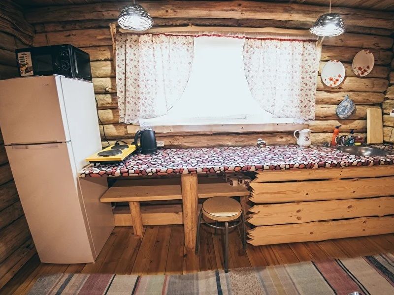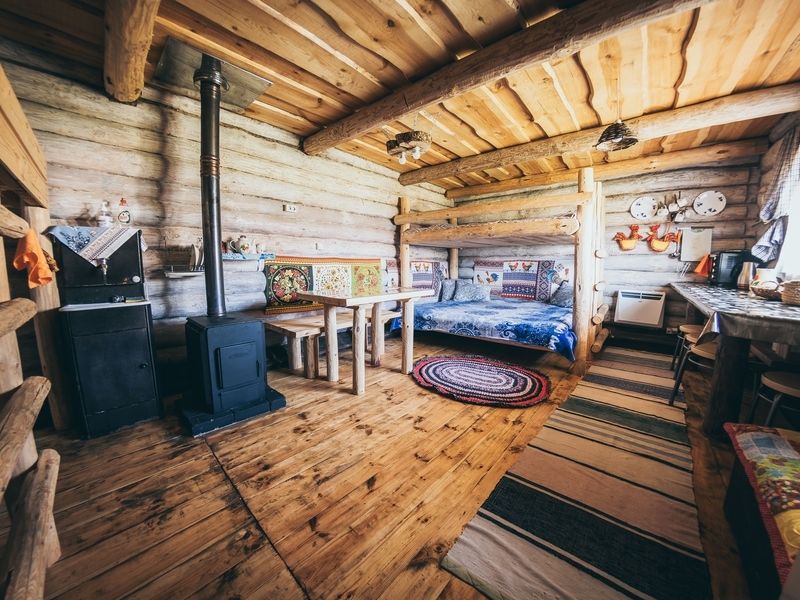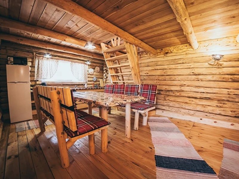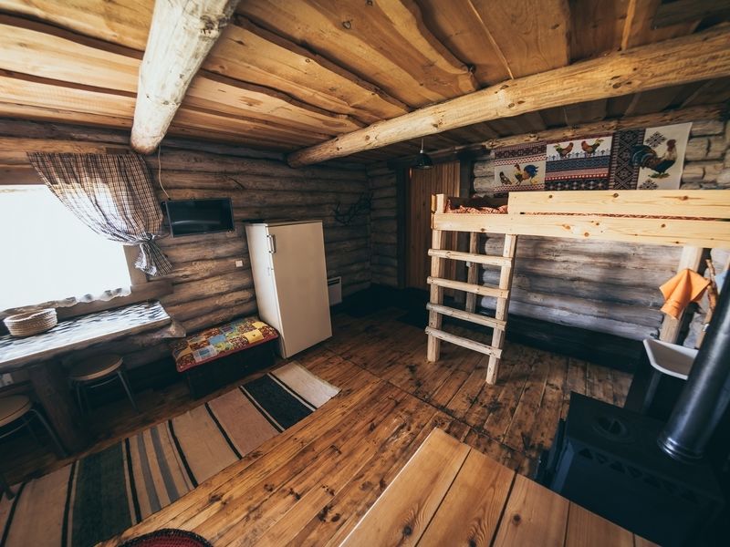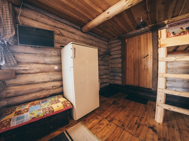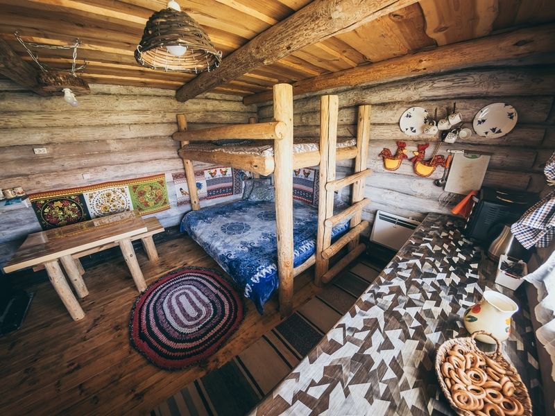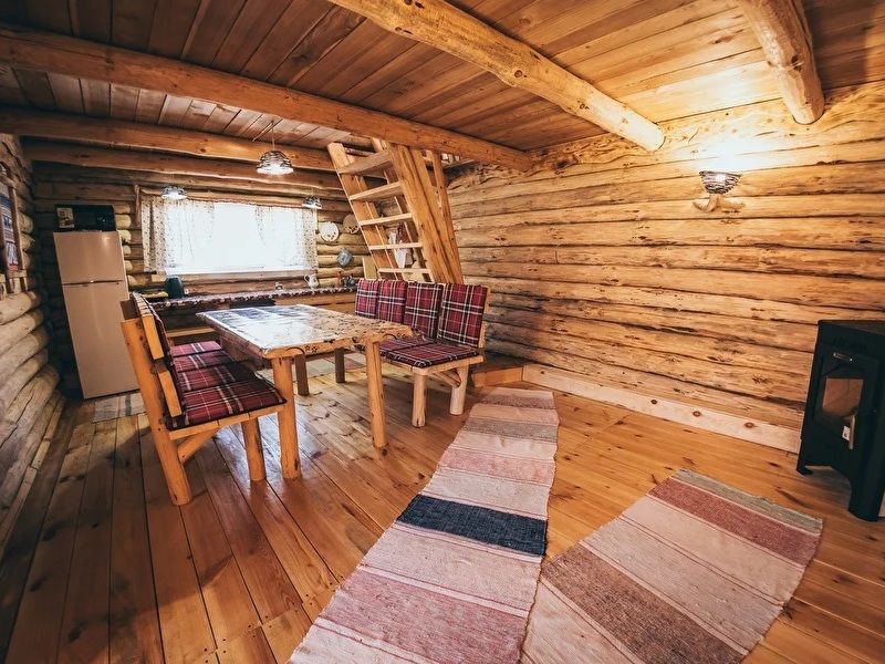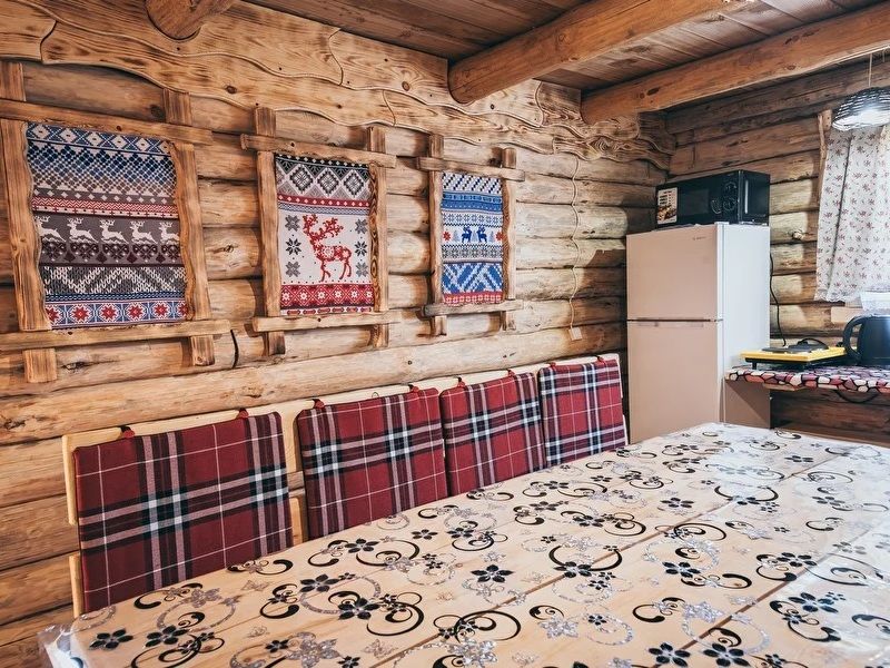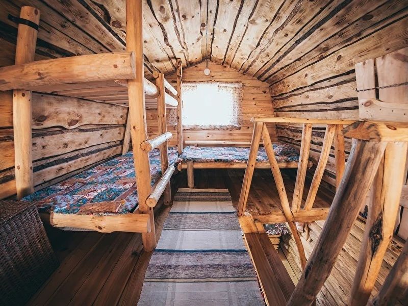 На территории находятся три отдельных дома из соснового дерева, два из которых оформлены в старорусском стиле и один – во флотском. Все дома с печным и электрическим отоплением, кухонной техникой, телевизорами и без удобств.