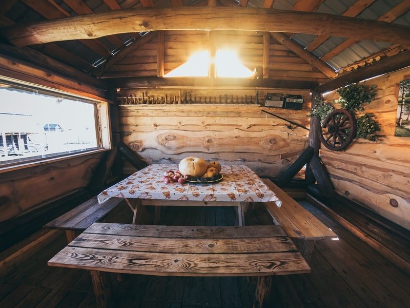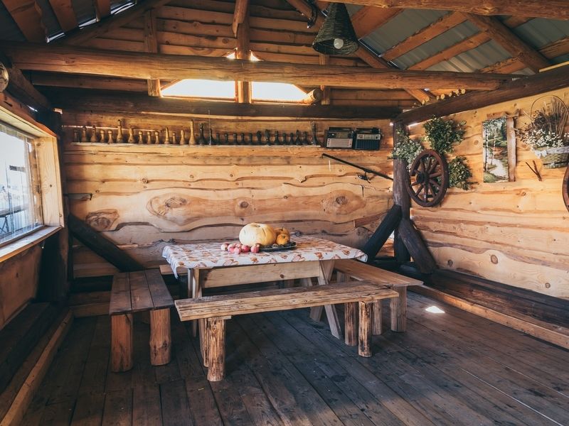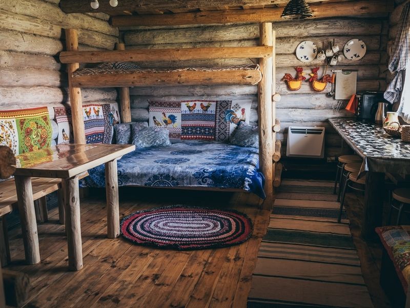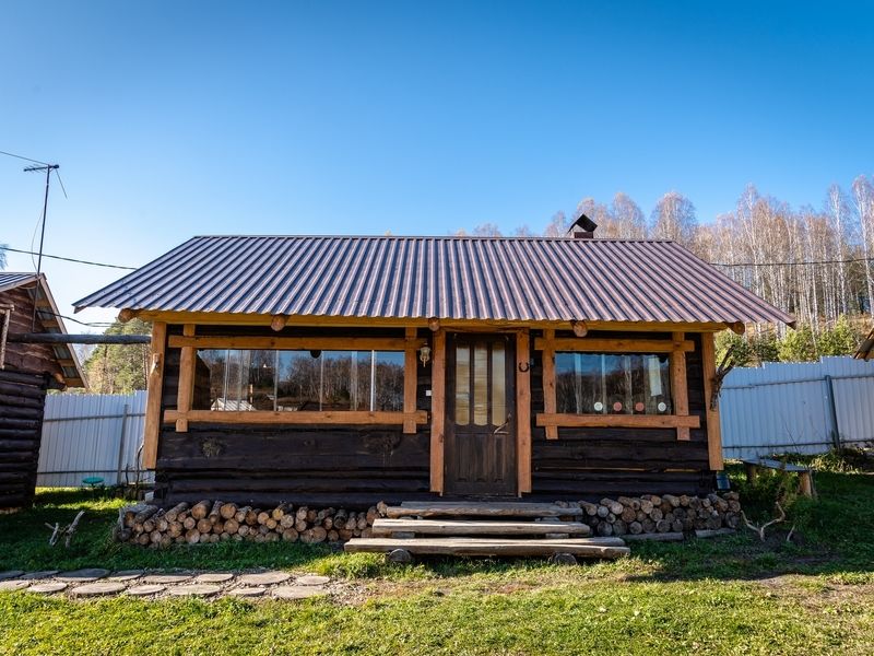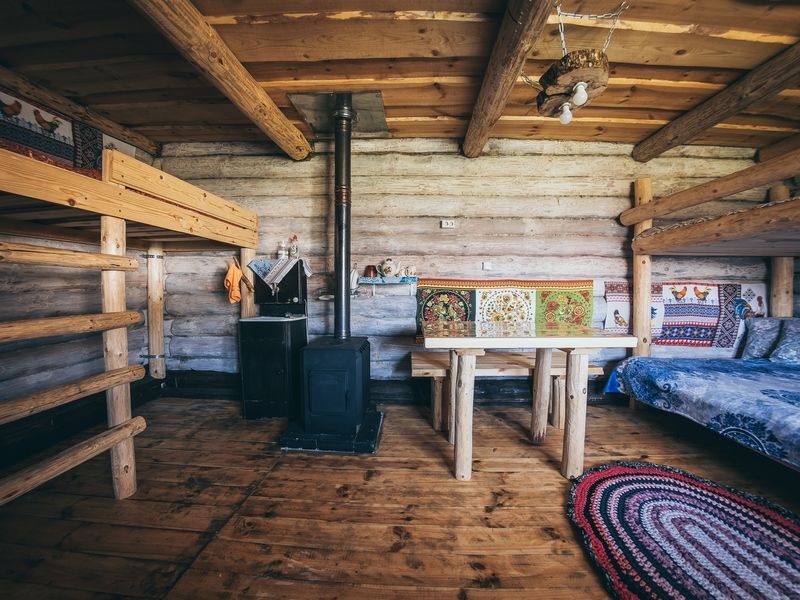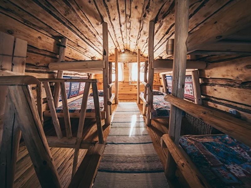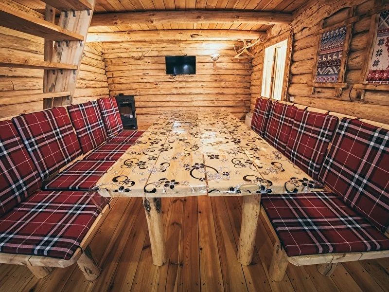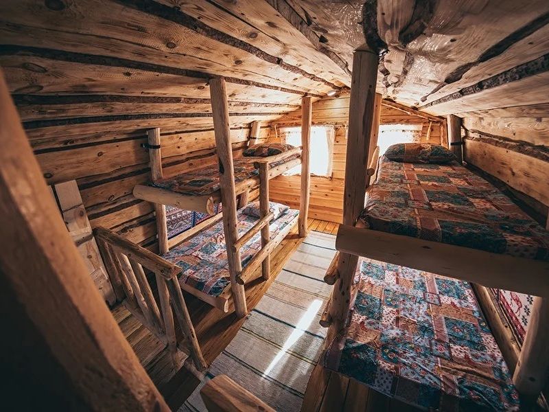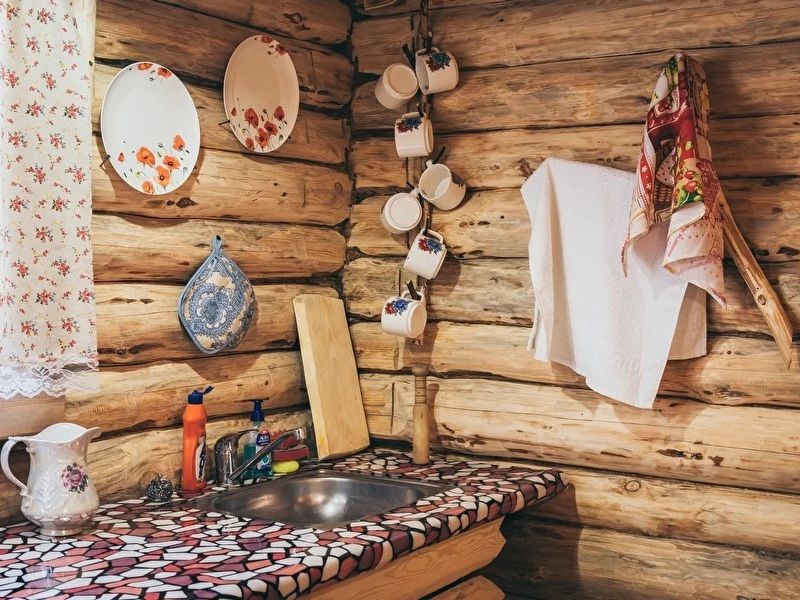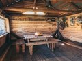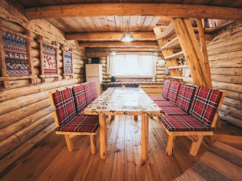 На территории находятся три отдельных дома из соснового дерева, два из которых оформлены в старорусском стиле и один – во флотском. Все дома с печным и электрическим отоплением, кухонной техникой, телевизорами и без удобств.