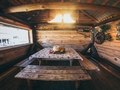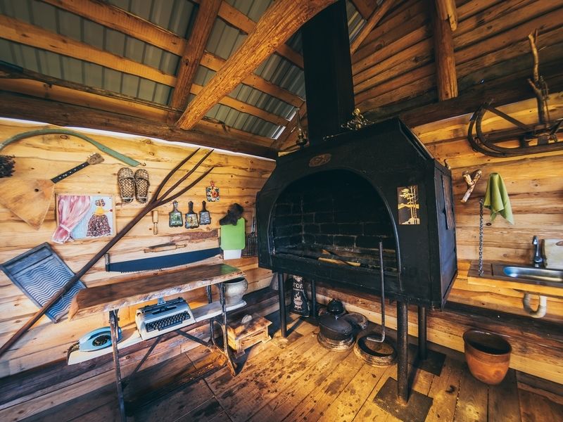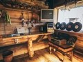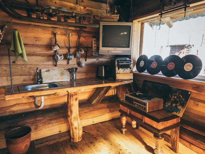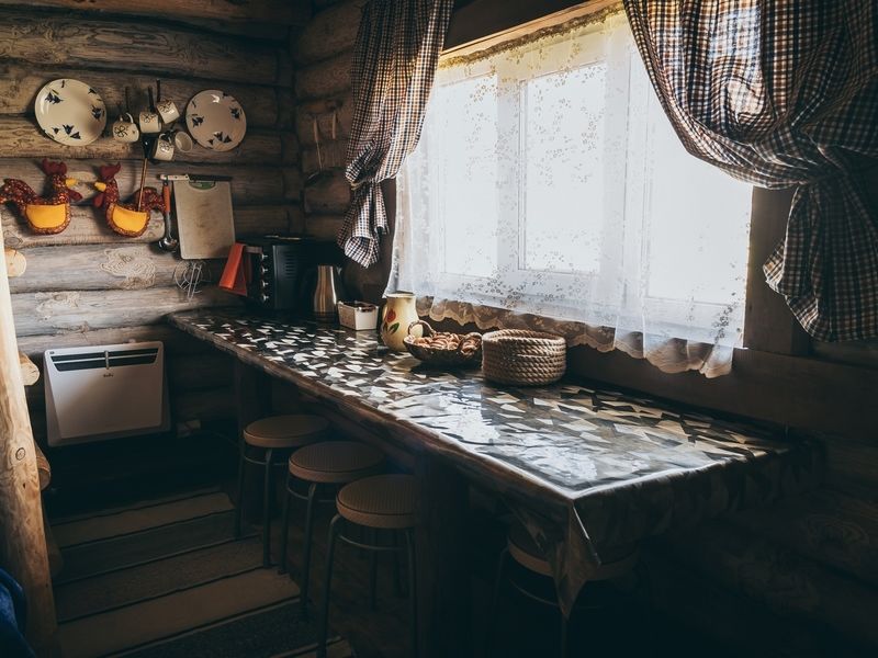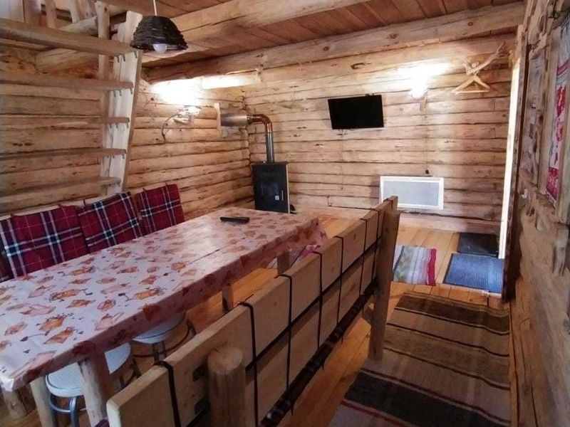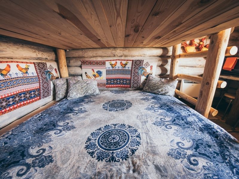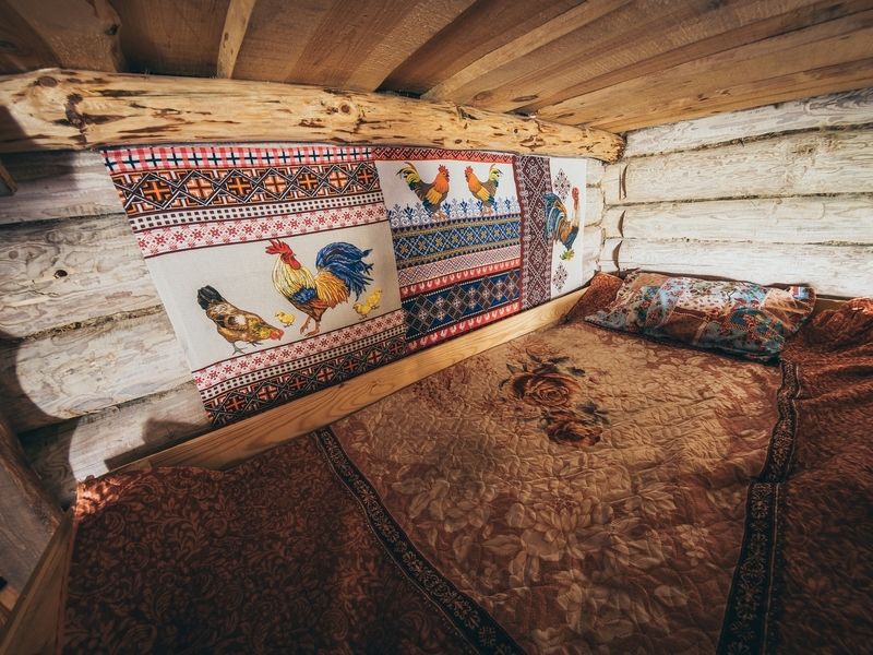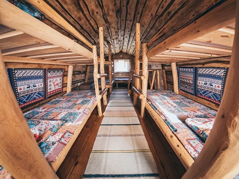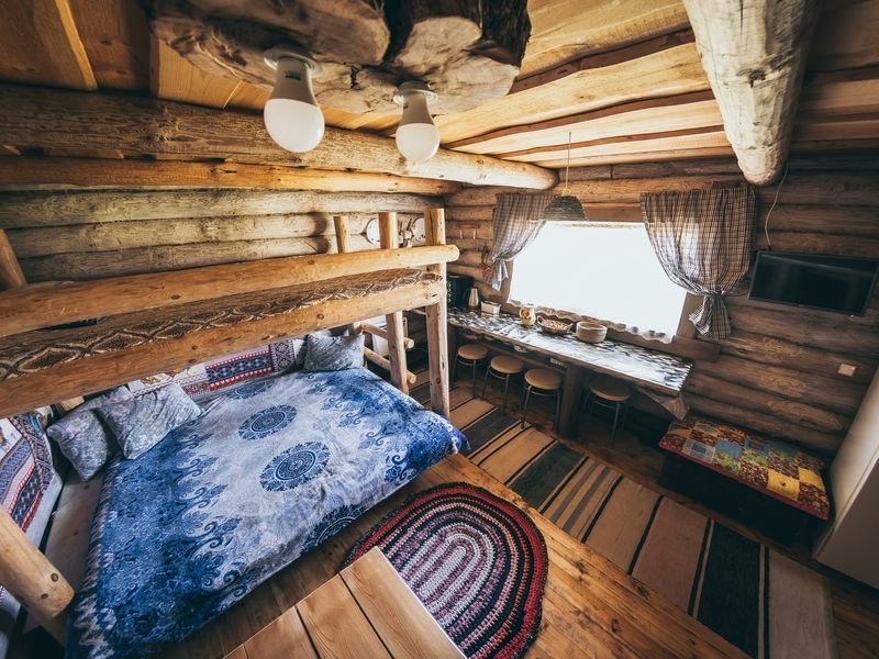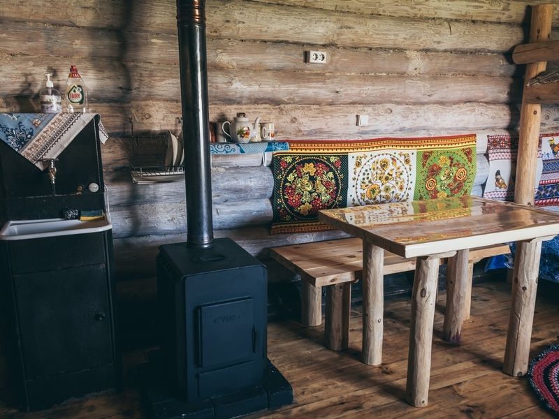 На территории находятся три отдельных дома из соснового дерева, два из которых оформлены в старорусском стиле и один – во флотском. Все дома с печным и электрическим отоплением, кухонной техникой, телевизорами и без удобств.