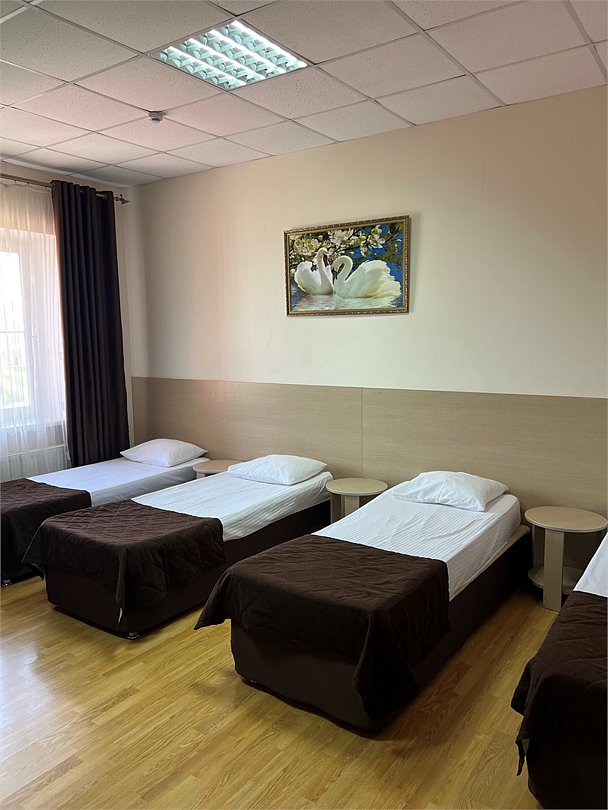 Wi-Fi, холодильник, кондиционер, фен, плита для приготовления пищи, банные полотенца, тумбы, стулья, обеденный стол, зеркало, кухня, набор посуды, раковина, обеденная зона, душ, кулер на этаже, вид во двор, четыре односпальные кровати, кухонная посуда, стаканы, туалетные средства, туалет, сплит-система, цифровое тв, мини-кухня, москитная сетка, гостиничная парфюмерия, услуги прачечной (платно)В номере