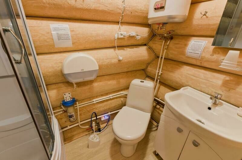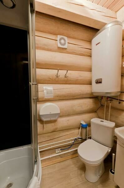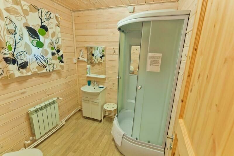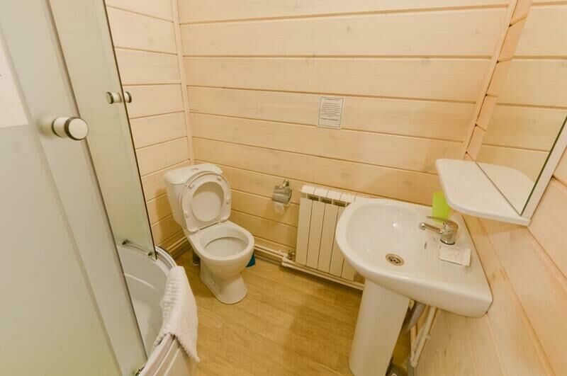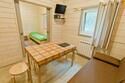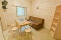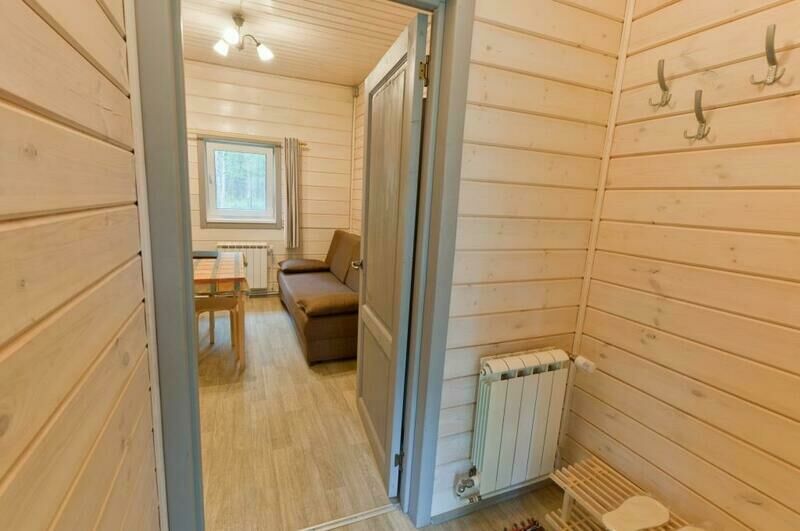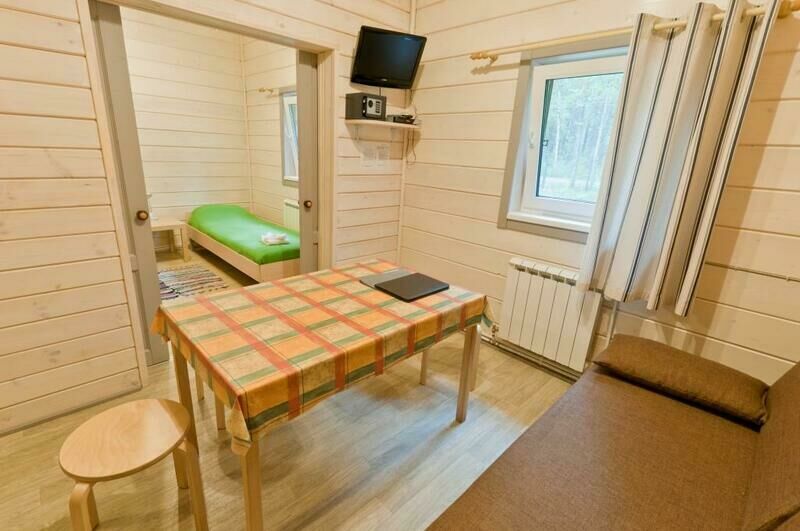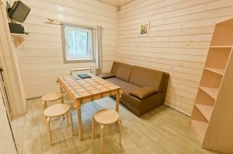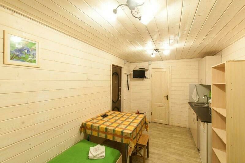 Одноэтажный коттедж-студия с уютной верандой, на которой стоит уличный столик и стулья. Коттедж разделен на 3 части: гостиную, оборудованную кухонным гарнитуром, спальню и туалетную комнату. В гостиной имеется удобный диван, на котором могут расположиться 2 гостя, стол с табуретками, шкаф, телевизор. В кухонный гарнитур встроен мини-холодильник, также есть микроволновая печь, мультиварка, электрочайник, раковина, посуда и столовые приборы на 4-х персон. В спальне находятся 2 односпальные кровати-трансформеры, из которых можно сделать 1 большую двуспальную , а также две тумбочки между ними. Туалетная комната оснащена душевой кабиной, раковиной, унитазом. В ней уже есть шампуни, мыло, полотенца, тапочки, туалетная бумага. В домике есть горячая и холодная вода, отопление.