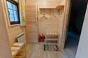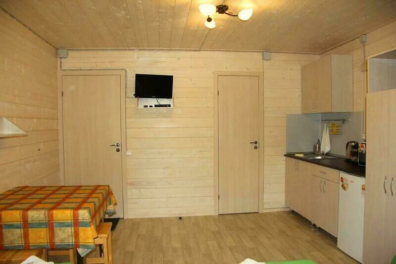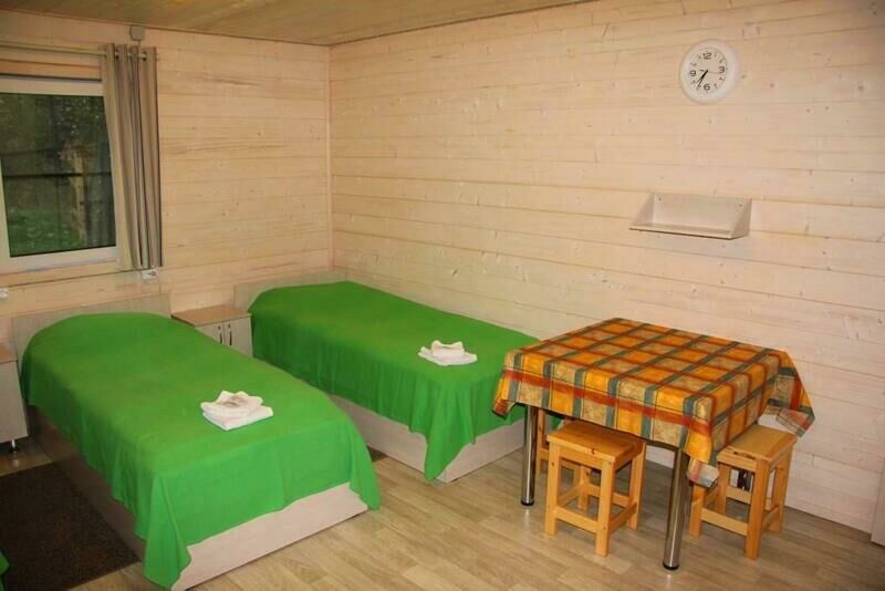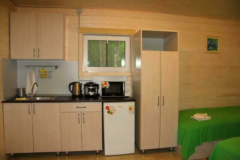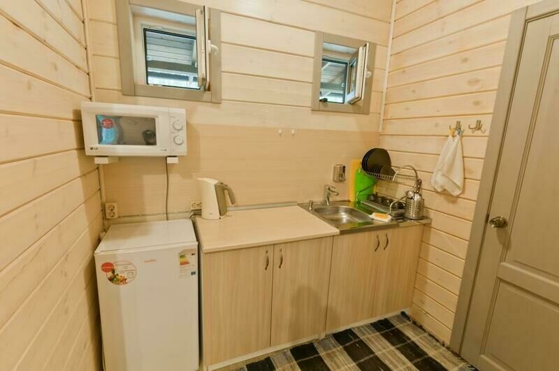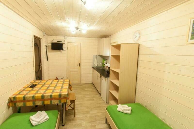 Каждый домик одноэтажный, имеются небольшие открытые веранды со столиком и стульями. Зайдя в домик Вы сразу попадаете в небольшую уютную гостиную-студию совмещенную с кухонным уголком, оборудованным холодильником, микроволновой печью, мультиваркой, необходимой посудой, раковиной с холодной и горячей водой, электрочайником и помпой с родниковой водой. В гостиной находятся 2-е полутораспальные кровати, обеденный стол и табуреты для двоих. Каждый домик оборудован отдельным санузлом с душем с горячей и холодной водой, раковиной и унитазом, а также всеми необходимыми принадлежностями-шампуни, мыло, полотенца, тапочки, туалетной бумагой. Рядом с каждым домиком расположена зона отдыха с мангалом, деревянным столом и 2-мя скамейками.