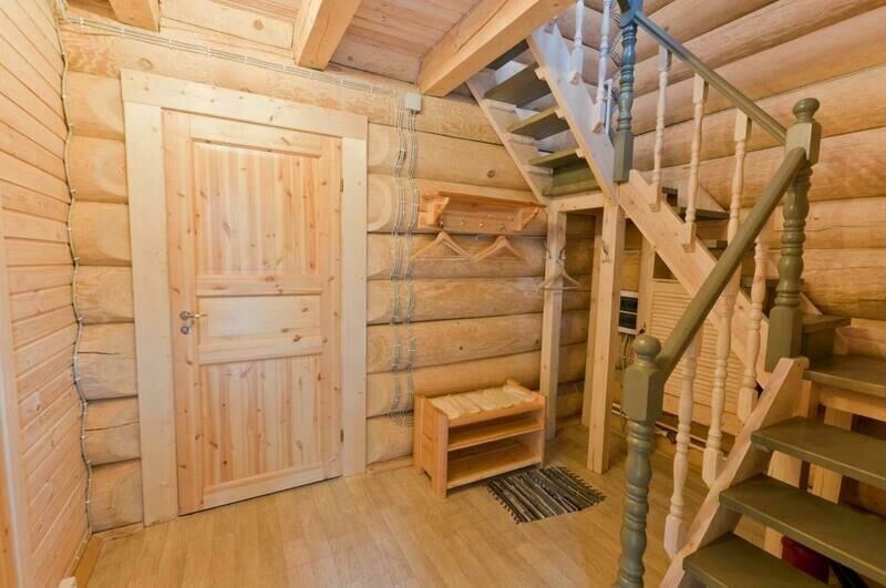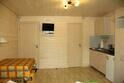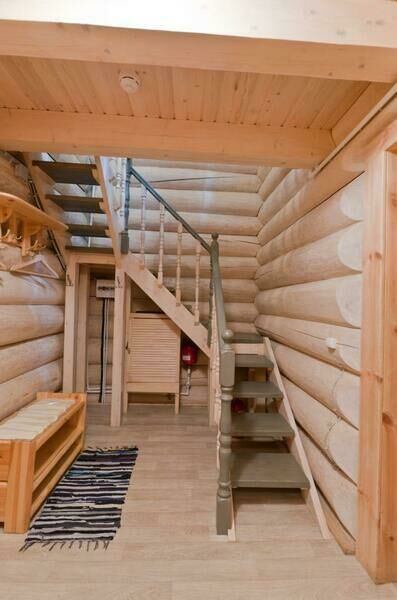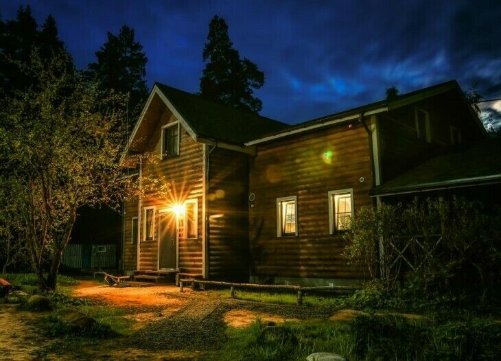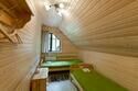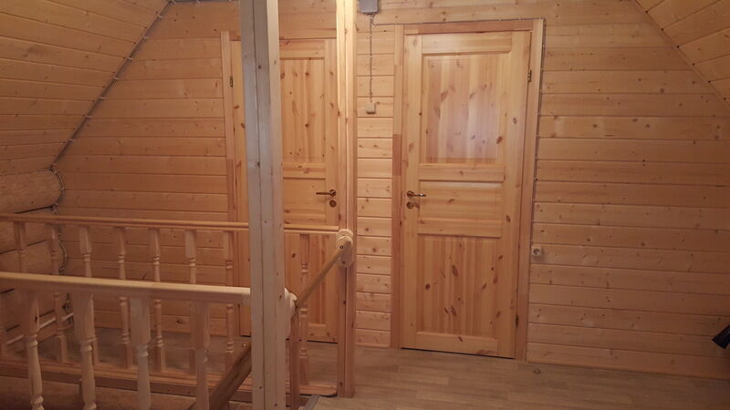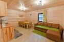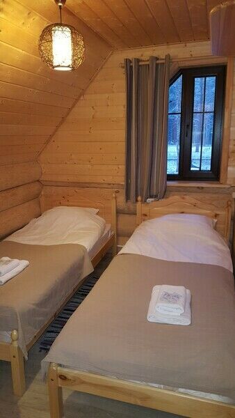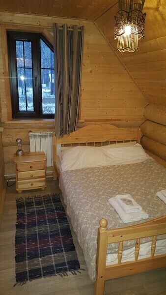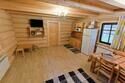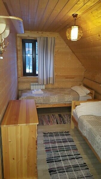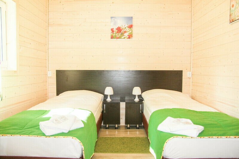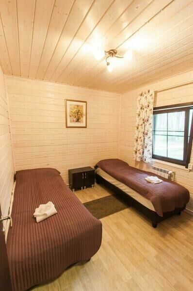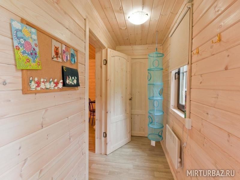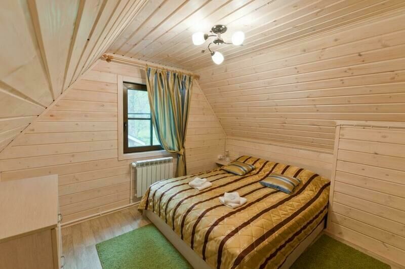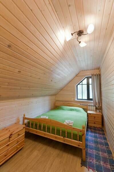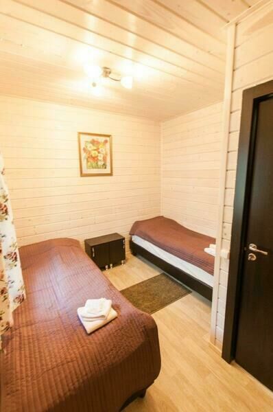 Двухэтажный коттедж с гостиной-столовой и 2-мя спальными комнатами. На первом этаже гостиная-студия с диваном на два спальных места, обеденным столом и мини-кухней, оборудованной холодильником, микроволновой печью, мультиваркой, электрическим чайником, а так же раковиной с горячей и холодной водой. Посуда и столовые приборы в наличии. Телевизор со спутниковой тарелкой. Туалетная комната с душевой кабиной, унитазом, раковиной, зеркалом, горячей и холодной водой. На втором этаже две спальных комнаты. В одной двухместная кровать с тумбочкой, в другой две полутороспальные кровати с двумя тумбочками. В холле второго этажа также диван на 2 места. Постельное белье предоставляется. Есть бесплатный Wi-Fi, тапочки, полотенца, фен, мыло, шампуни. Центральное отопление во всем доме.
