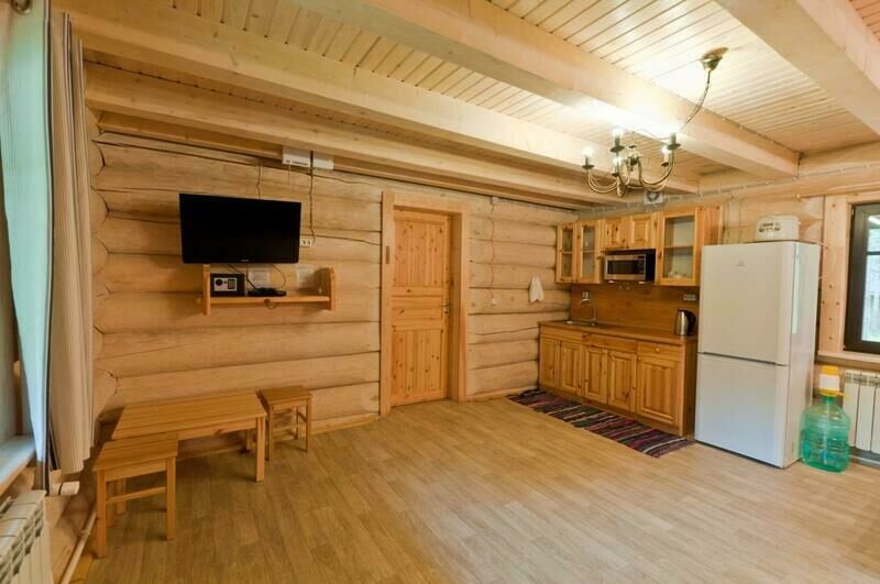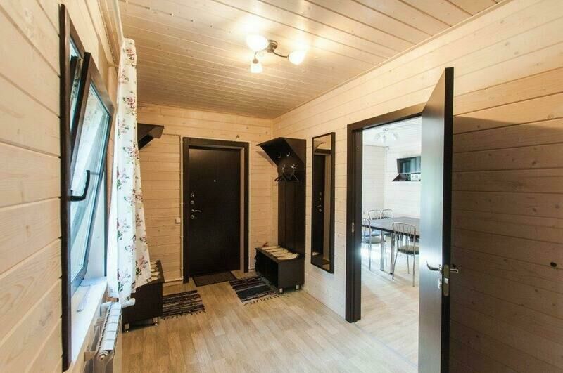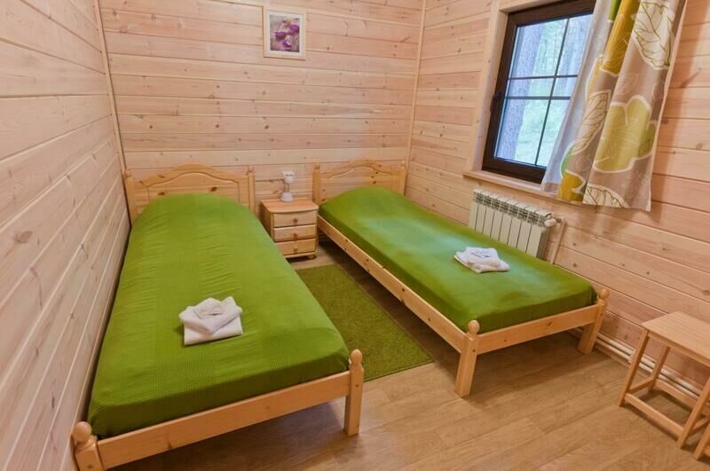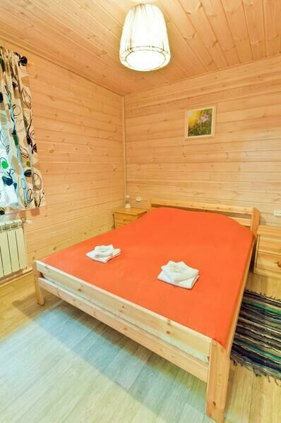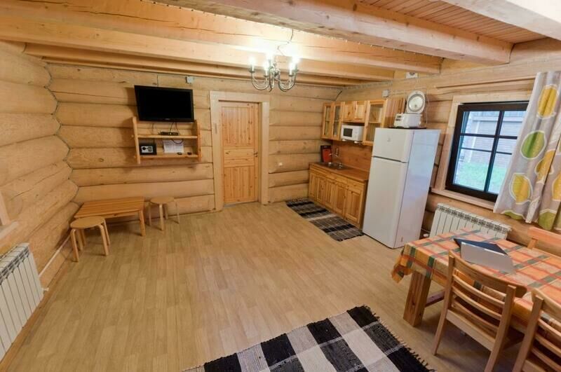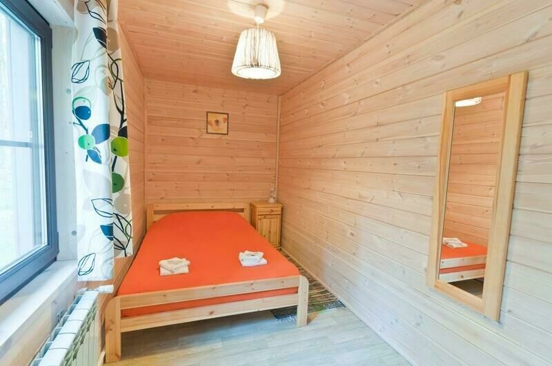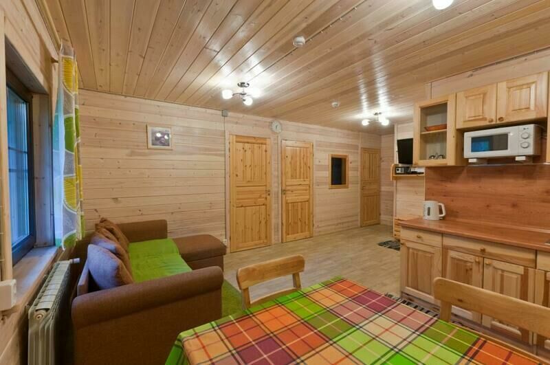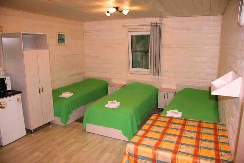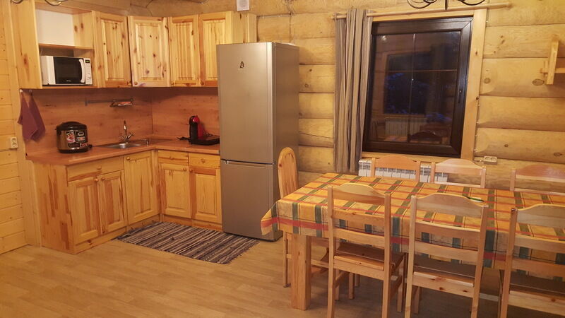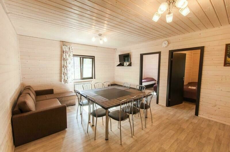 Большой одноэтажный коттедж с гостиной-столовой и 3-мя отдельными спальными комнатами. Из прихожей вы сразу попадаете в гостиную с кухонной частью, где имеется раковина с холодной и горячей водой, холодильник, микроволновка, мультиварка, электрочайник, наборы посуды и столовых приборов, рассчитанные на всех гостей. Здесь же стоит обеденный стол и двуспальный диван, на стене висит телевизор, подключенный к кабельному. Туалетная комната с холодной и горячей водой, оборудована душевой кабиной, унитазом, раковиной, над которой зеркало. Одна спальная с двуспальной кроватью. В двух других по две полутороспальных. Гостям предоставляются постельное белье, тапочки, полотенца, фен, туалетные принадлежности. Во всех помещениях функционирует центральное отопление и доступен бесплатный интернет Wi-Fi.