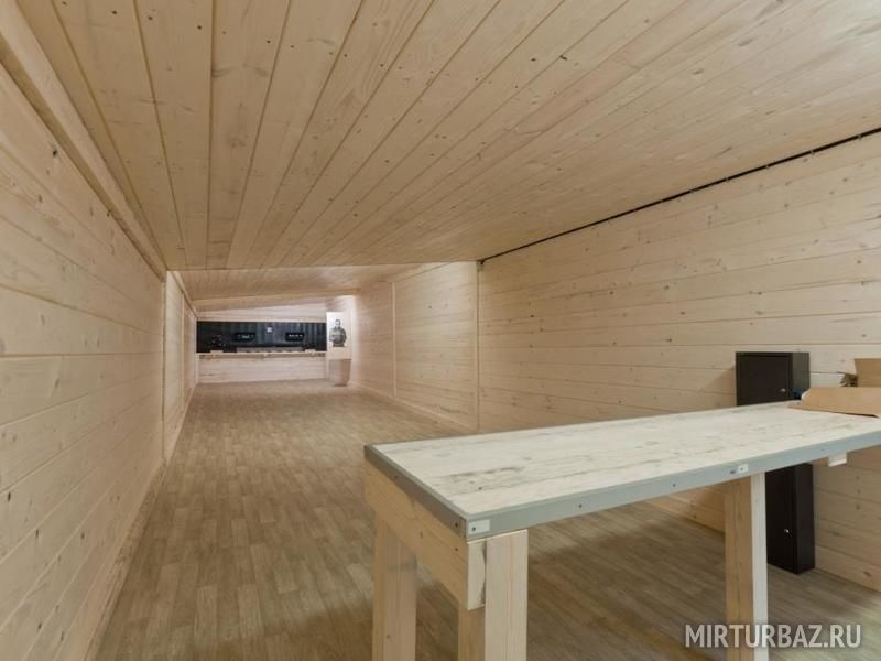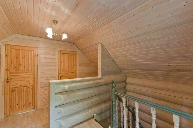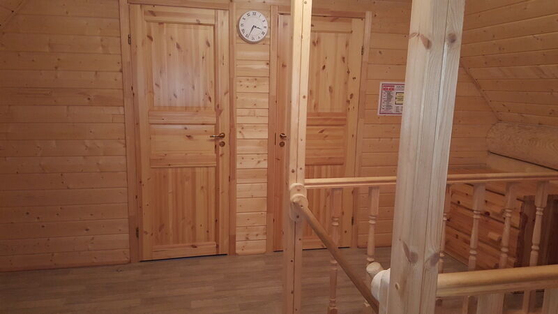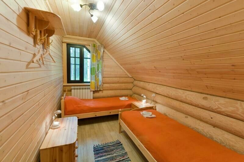 Двухэтажный коттедж с гостиной-столовой и 4-мя спальными комнатами. На первом этаже просторная гостиная с тремя зонами. Первая отведена под кухню – там вы найдете большой холодильник, микроволновую печь, мультиварку, чайник, раковину, столовые приборы и посуду. Вторая зона является обеденной – там стоит стол и на стене висит телевизор, который подключен к спутниковой антенне. Третья зона предназначена для отдыха – там стоит большой угловой диван, который раскладывается на 2 спальных места. В туалетной комнате стандартный набор: душевая кабина, раковина с зеркалом, унитаз. Наборы тапочек, полотенец, туалетных принадлежностей, фен. На втором этаже четыре спальни. В половине из них установлены двуспальные кровати. В остальных – по две полутороспальные. Во всех помещениях центральное отопление и бесплатный интернет Wi-Fi. На кухне и в туалете горячая и холодная вода.