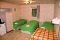 Уютный деревянный, коттедж-студия. Отличное решение для отдыха 3-х гостей или семьи с ребенком. Одноэтажный домик , имеется небольшая открытая веранда со столиком и стульями. Зайдя в коттедж, Вы сразу попадаете в небольшую уютную гостиную-студию совмещенную с кухонным уголком, оборудованным холодильником, микроволновой печью, мультиваркой, необходимой посудой, раковиной с холодной и горячей водой, электрочайником. В гостиной находятся 3 полутораспальные кровати, обеденный стол и табуреты для троих. Напротив кроватей установлен телевизор со спутниковыми каналами. Домик оборудован отдельным санузлом с душем с горячей и холодной водой, раковиной и унитазом, а также всеми необходимыми принадлежностями-шампуни, мыло, полотенца, тапочки, туалетной бумагой. Рядом с каждым коттеджем расположена зона отдыха с мангалом, деревянным столом и 2-мя скамейками.