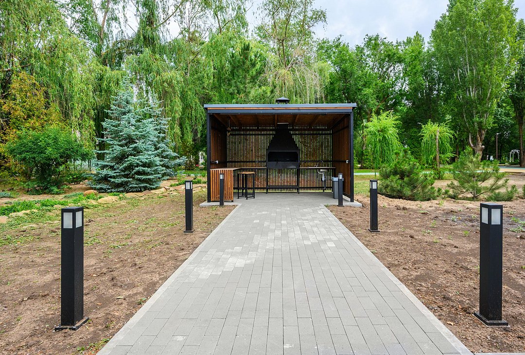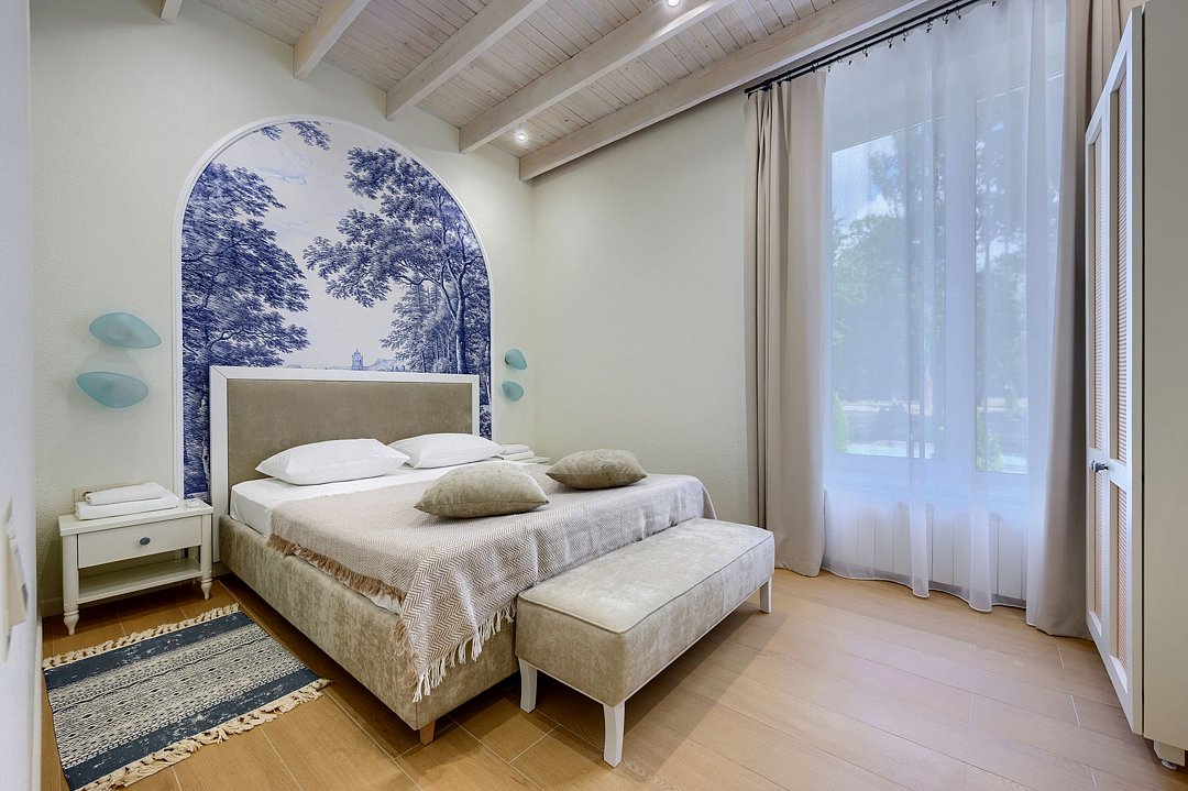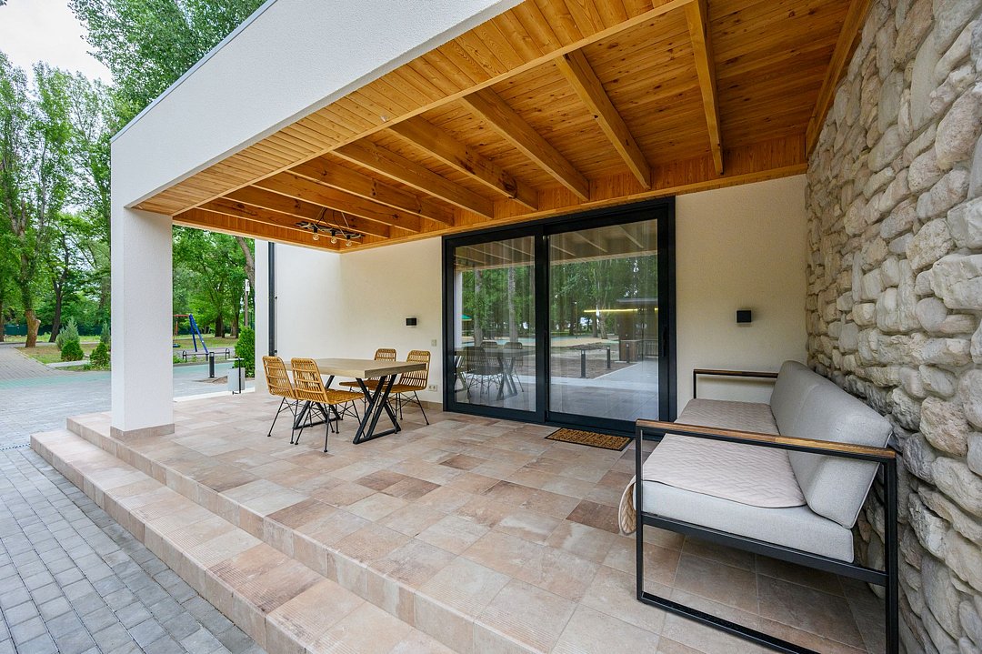 2 спальни, большая кухня-гостиная, современный санузел, премиум принадлежности, мангал с барной стойкой, диван, стол и стулья на террасе.