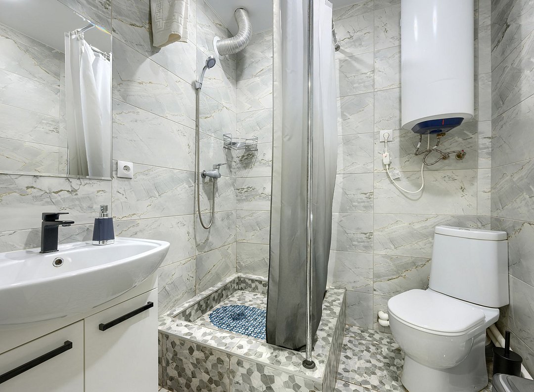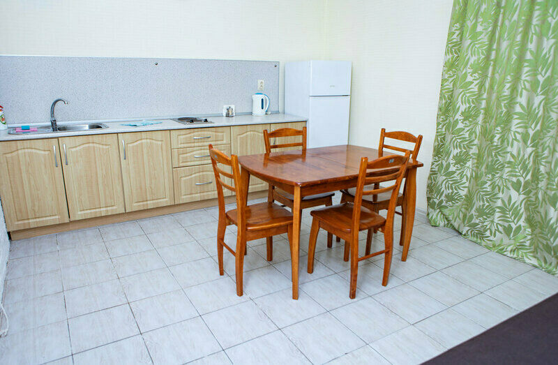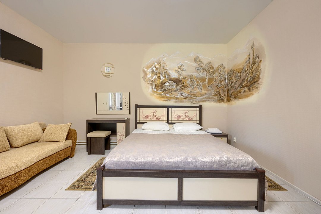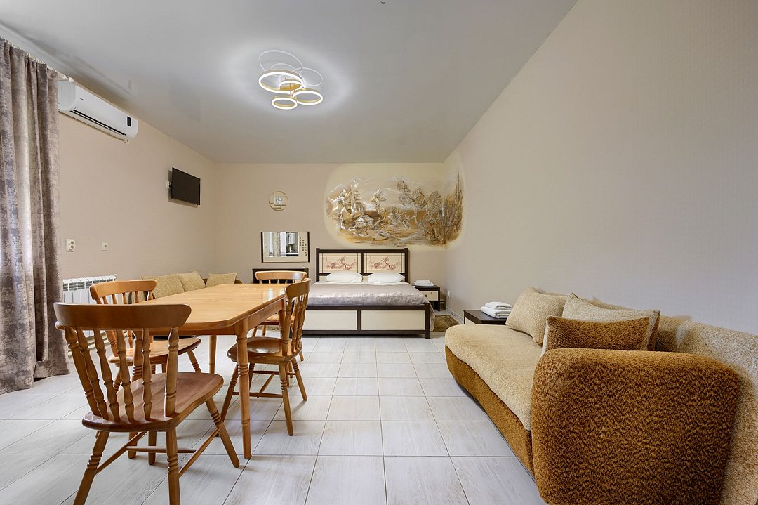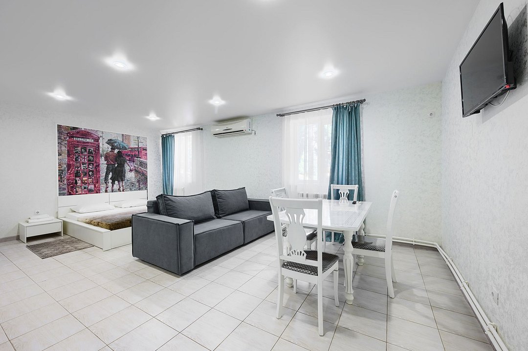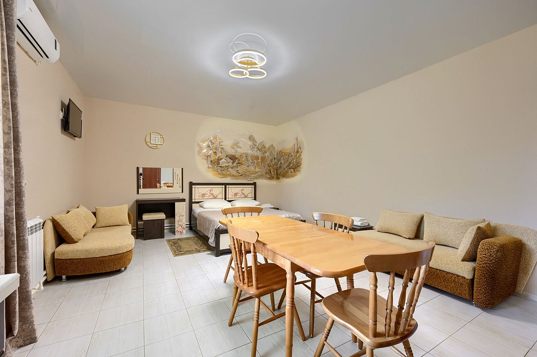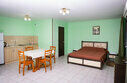 Студия, 2-х местный номер. Прихожая, спальная комната с гостиной и кухонной зоной, ванная комната с душем. Возможно 2 доп. места