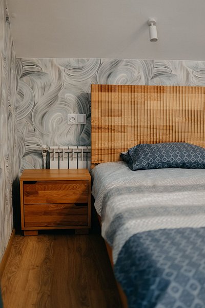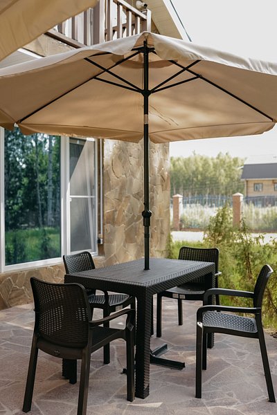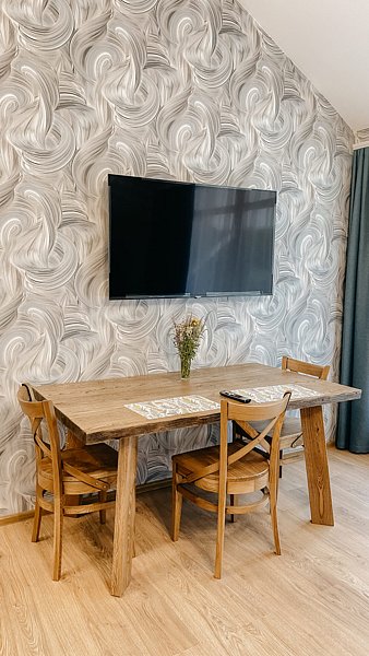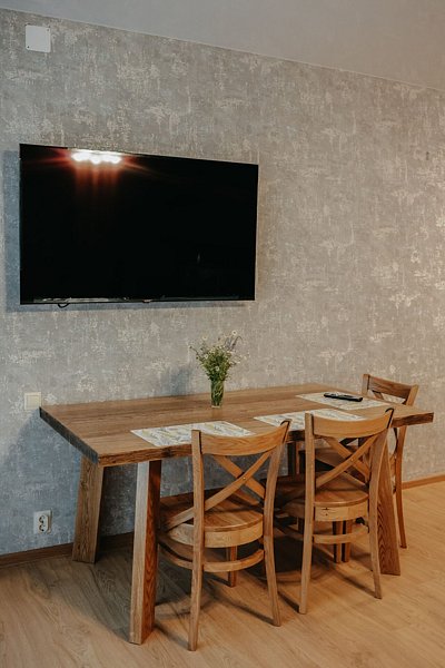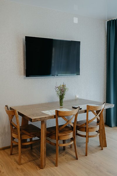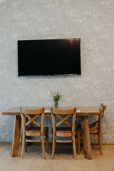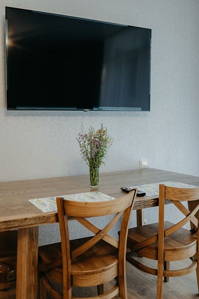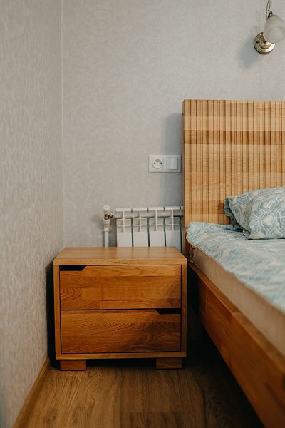Натуральная мебель из массива дуба (кровать 180х200, стол, 3 стула, тумбочка), балкон или терраса с уличной мебелью, питьевая вода прямо из-под крана.