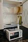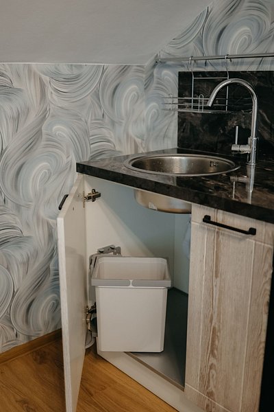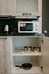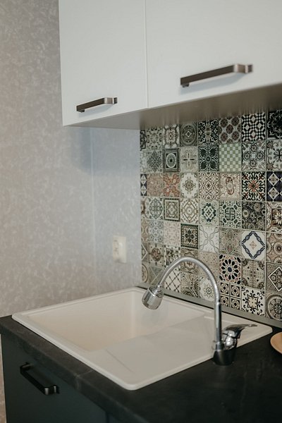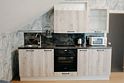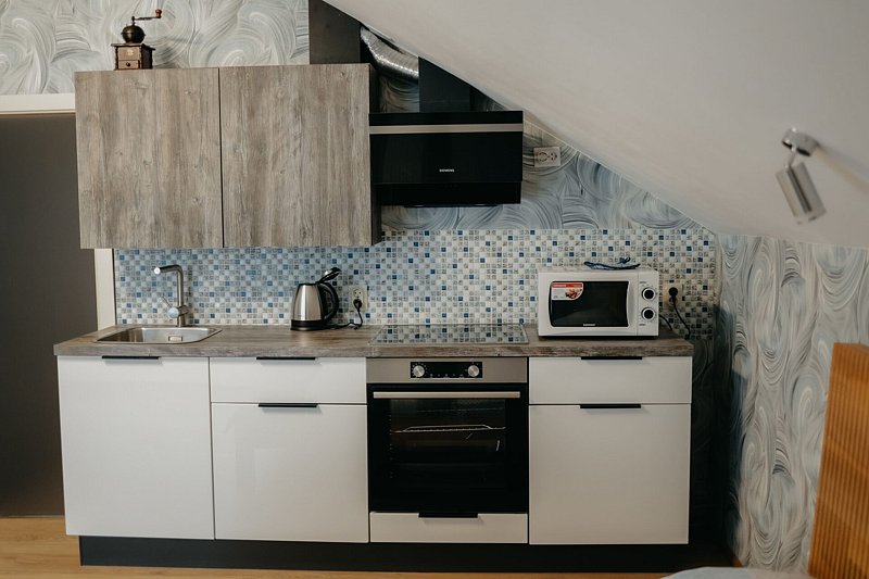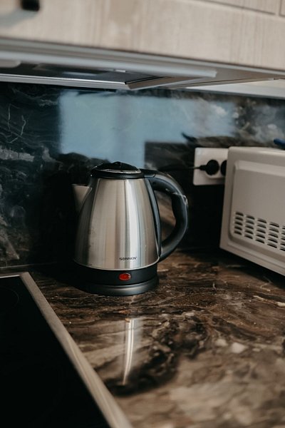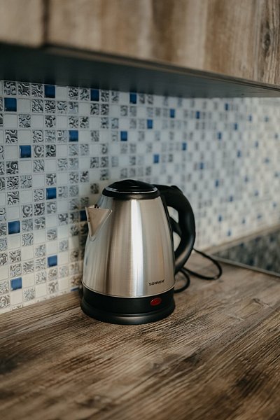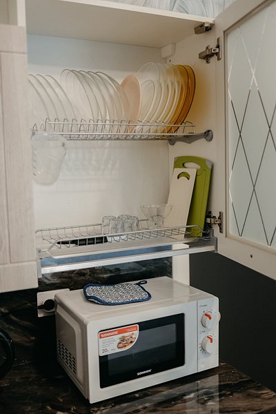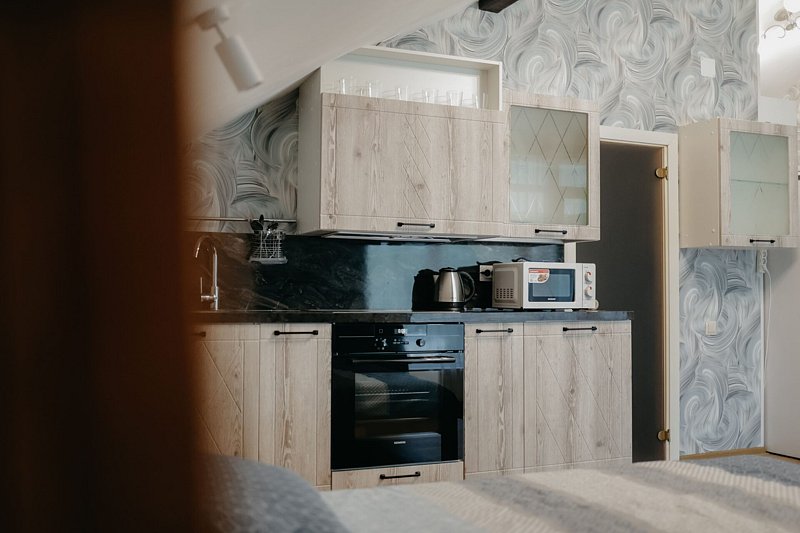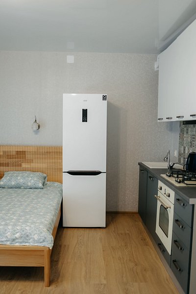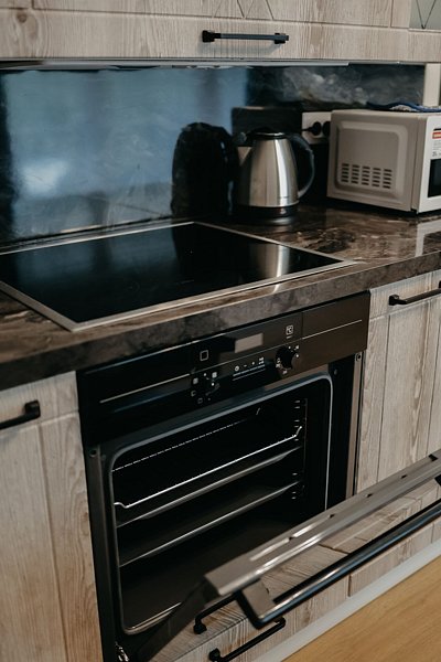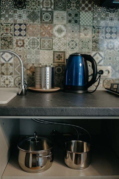 В кухонной зоне имеется все необходимое для готовки. В вашем распоряжении холодильник, варочная поверхность, набор посуды и электрический чайник.
