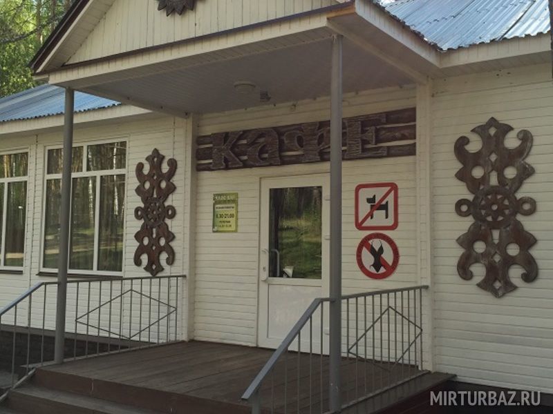Кафе работает по заказному и комплексному меню. Летом принимает гостей открытая площадка с блюдами, приготовленными в Вашем присутствии на мангале. Теплица, расположенная на территории, поставляет свежую зелень круглый год.